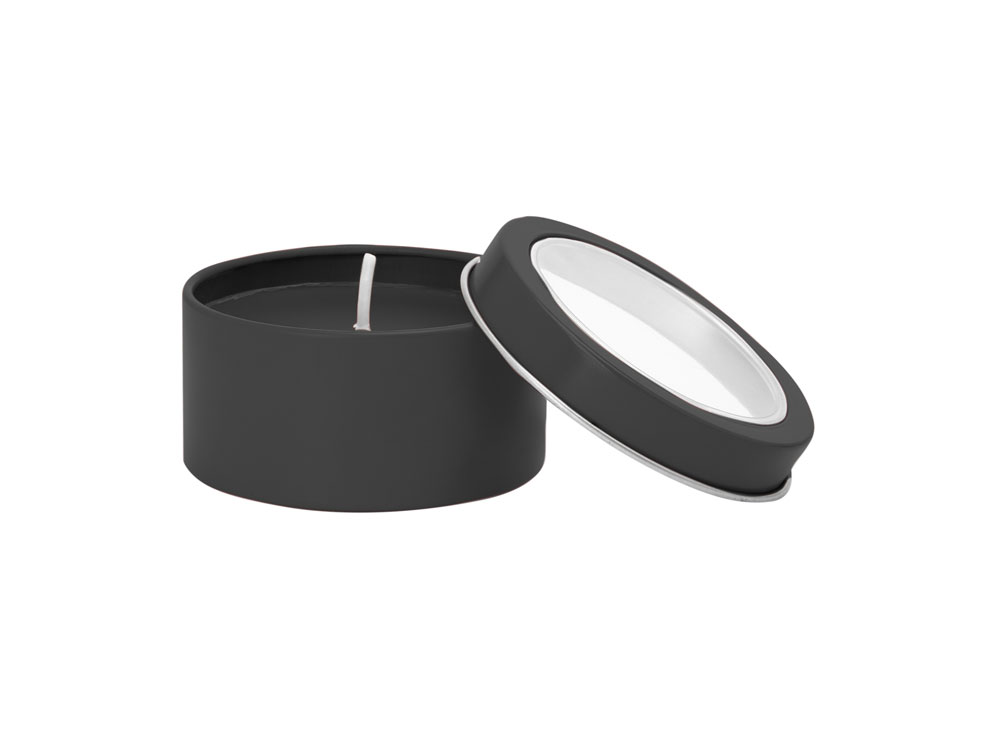 Ароматическая свеча с запахом ванили в металлическом круглом подсвечнике с крышкой с прозрачным окошком. Цвет свечи в тон подсвечника. белый фитиль