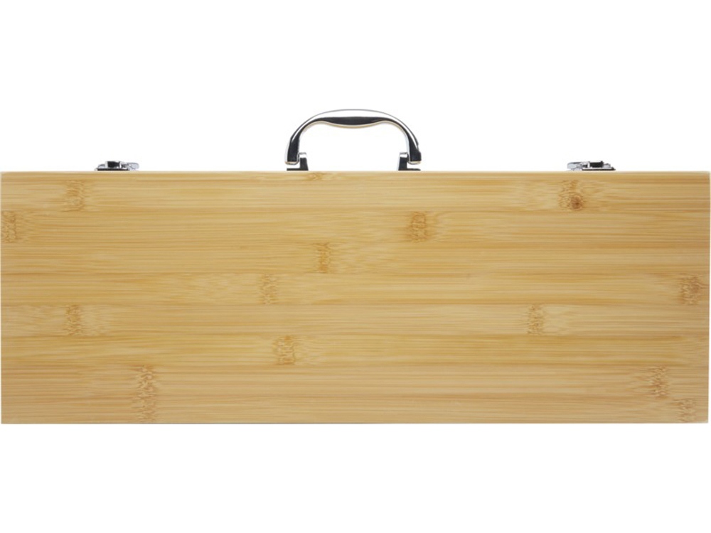 Набор для барбекю из 3 предметов из бамбука: лопатка (42 x 9,5 см), щипцы (46 x 2,2 см) и вилка (43 x 3,2 см). Набор поставляется в подарочной коробке из бамбука (51,5 x 18,2 x 7,2 см). Ручки и подарочная коробка изготовлены из бамбука, который производится в соответствии со стандартами устойчивого развития.