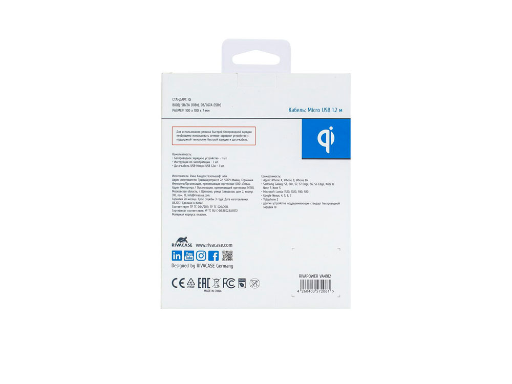 Беспроводное зарядное устройство. • Универсальное беспроводное зарядное устройство совместимо со всеми моделями мобильных устройств, поддерживающих стандарт беспроводной зарядки Qi. • Поддержка режима быстрой беспроводной зарядки. • Световая индикация всех режимов работы. • Компактный размер. • Кабель Micro USB 1,2м в комплекте. Спецификация: • Стандарт: Qi • Вход: 5В/2А (10Вт), 9В/1,67А (15Вт).