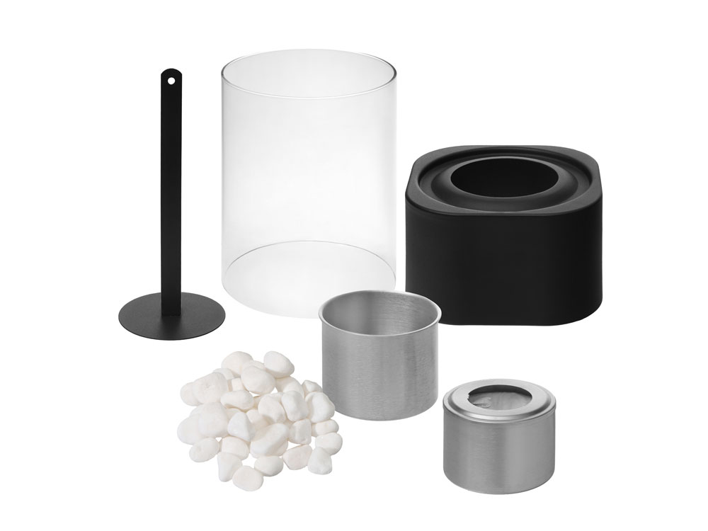 Комплектность стеклянная колба из закаленного стекла, металлическая заглушка, металлическое основание, декоративные камни, емкость для биотоплива