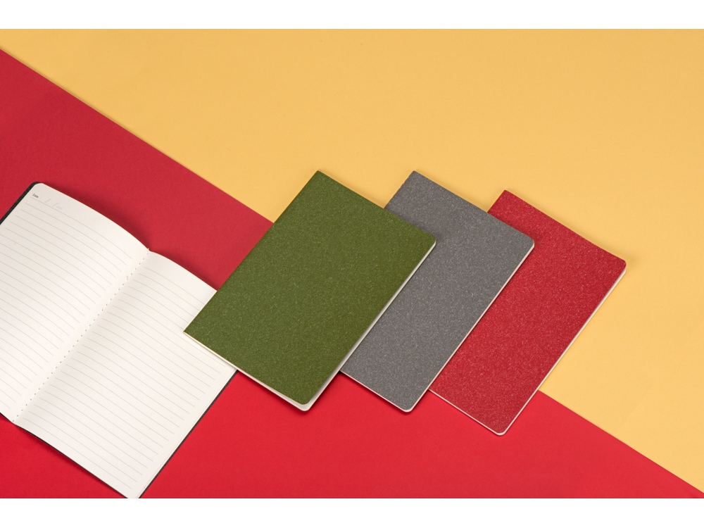 Универсальный блокнот в трендовых оттенках. Обложка матового цвета с эффектом меланж. Прошитый нитками блок на 60 линованных страниц.