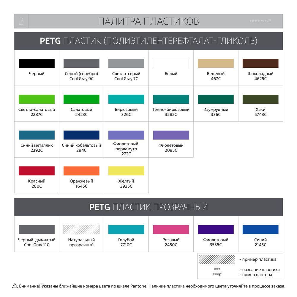 Отправляя запрос, укажите в поле «Примечание» формы заказа цвет пластика. Варианты цветов можно посмотреть в разделе «Фотографии».