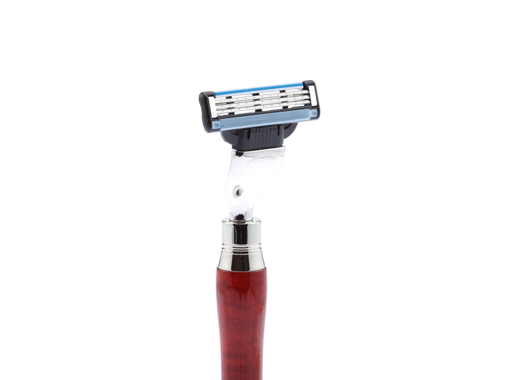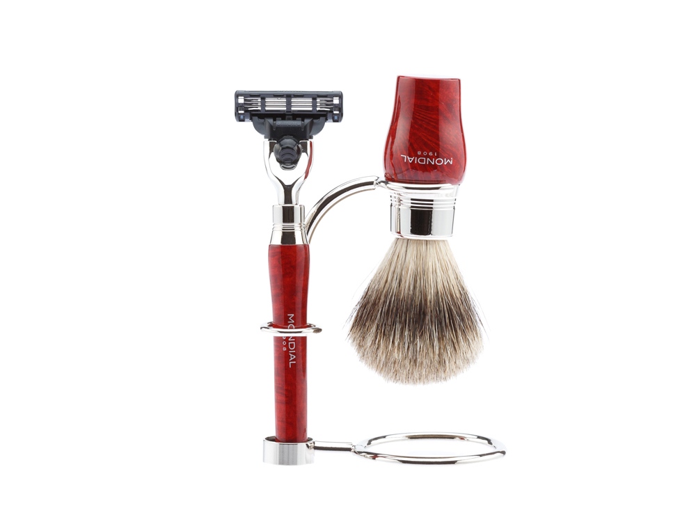 Ассортимент бритвенных аксессуаров MONDIAL является эталоном для всех видов бритья. Только лучшие материалы обретают форму в опытных руках итальянских мастеров. Бритвенный набор из лимитированной коллекции MONDIAL разработан лучшими итальянскими дизайнерами. В наборе идеально сочетаются искусно обработанная древесина корня шиповника и великолепный ворс барсука. Минималистичный, но элегантный дизайн бритвенного набора – уникальный в своем роде современный элемент роскоши, это возможность выйти за рамки моды для создания аутентичного итальянского стиля вне времени. Бритвенный набор MONDIAL • бритвенный станок, совместимый с кассетами Gillette MACH3 (одна кассета в комплекте); • помазок с барсучьим ворсом категории Best Badger, диаметр узла - 20 мм (размер M); • подставка из никелированной латуни Помазок Тип ворса: Натуральный барсучий ворс категории Best Badger Диаметр узла: 20 мм (размер M) Материал рукояти: корень шиповника, никелированная латунь Размеры: высота помазка - 118 мм, высота рукояти - 60 мм, диаметр основания - 32 мм Вес: 80 гр. Станок Тип лезвия: Gillette MACH3 Материал рукояти: корень шиповника, никелированная латунь Размеры: высота станка с лезвием - 137 мм Вес: 35 гр. Подставка подставка для бритвенного станка и помазка изготовлена из никелированной латуни