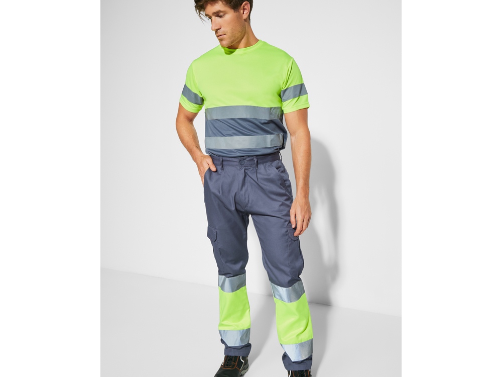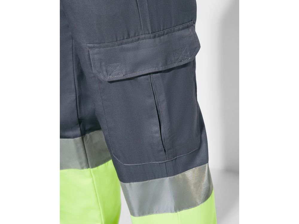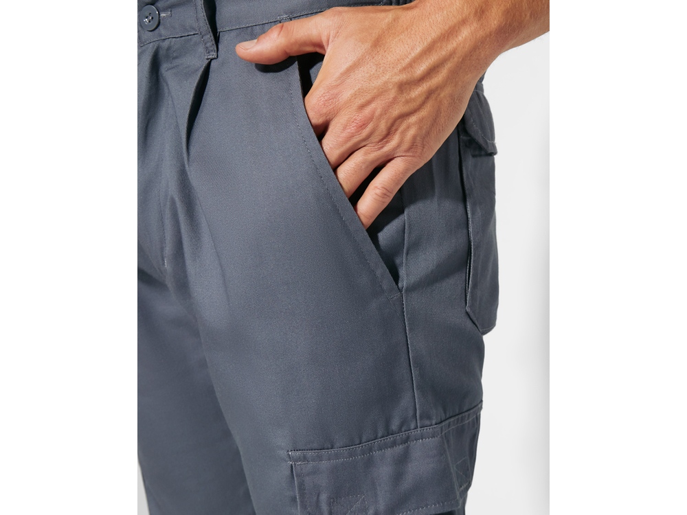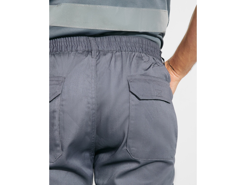 Летние брюки с карманами. 1. Эластичный пояс сзади. 2. Два карманы сзади с клапаном на липучке. 3. Два карманы спереди и два объемных карманы по бокам с клапаном на липучке. 4. Сочетание двух цветов и светоотражающих полос.