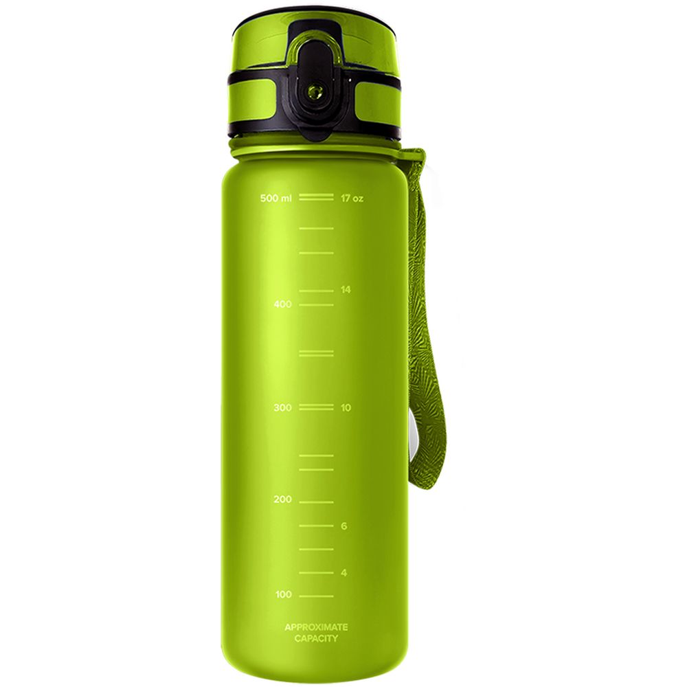 Матовое бархатистое покрытие бутылки приятно на ощупь, широкий ремешок дополнительно фиксирует бутылку во время использования, защитный колпачок не даст воде пролиться в сумке.