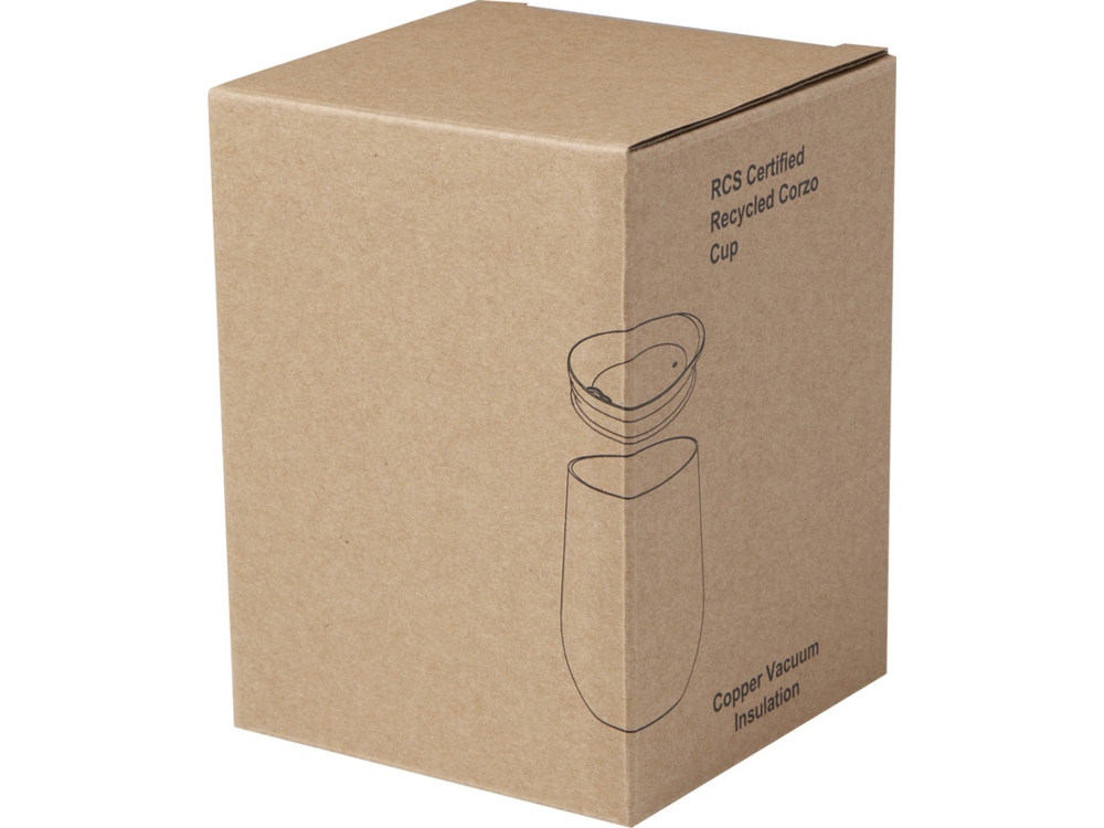 Corzo изготовлен из нержавеющей стали, сертифицированной RCS, и имеет вакуумную конструкцию с двойными стенками и медной изоляцией, которая сохраняет напитки горячими в течение 6 часов или холодными в течение 24 часов. Конструкция препятствует образованию конденсата на внешней стороне чашки. Стакан с нажимаемой крышкой прост в использовании. На наружный корпус нанесено порошковое покрытие. Широкое горлышко для комфортного наполнения и заливки. Объем 350 мл. Поставляется в подарочной коробке из переработанного картона. Recycled stainless steel.