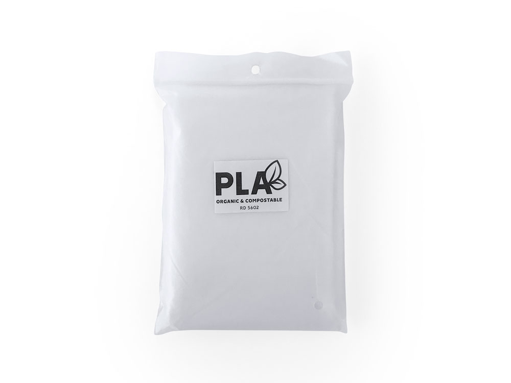 Прозрачный дождевик из компостируемого материала. Единый размер для взрослых с капюшоном и отверстиями для рук. Поставляется в мешочке из PLA 10 x 13,5 см.
