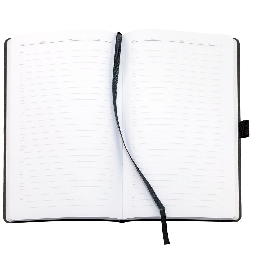 Ежедневник с гибкой обложкой, выполнен из материала Nubuck Touch, черный АА, дополнен ляссе и петлей-резинкой для ручки черного цвета.