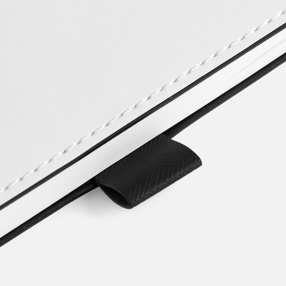 Гибкая обложка, материал обложки — Soft Touch, белый BB и Latte, черный АА; материал петли для ручки — Nice Touch, черный АА. Срез обложки окрашен в черный цвет.