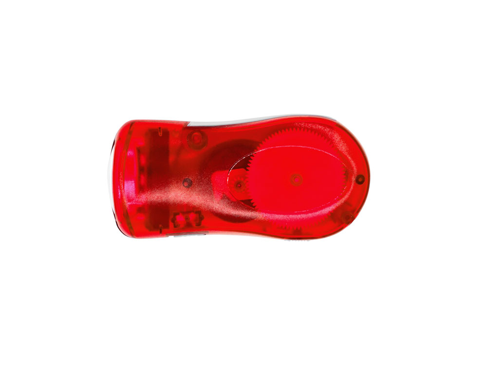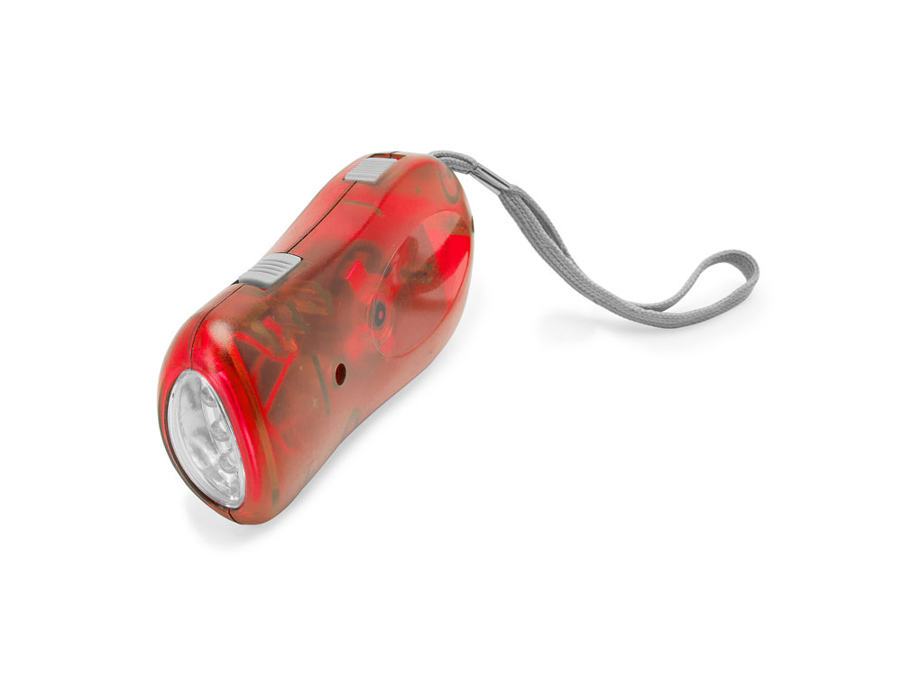 Фонарик с 3 светодиодами и динамо-зарядкой. Доступен в различных полупрозрачных цветах, с серым ремешком для переноски