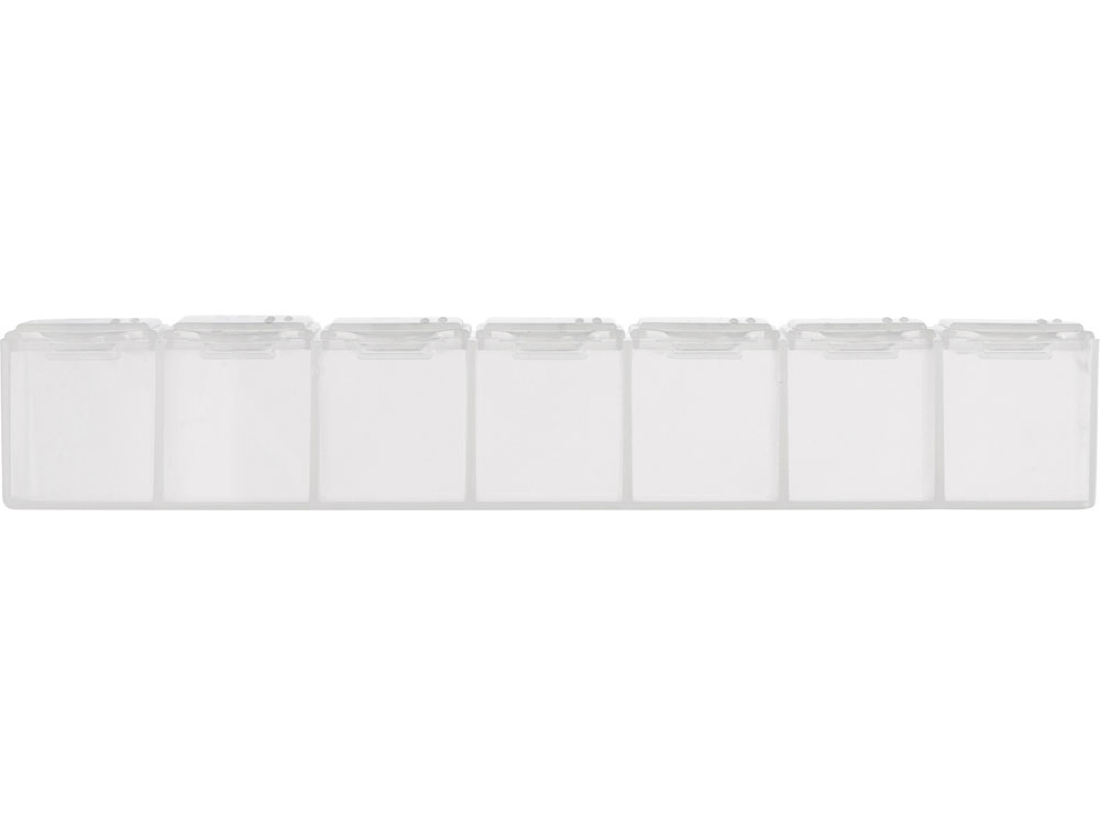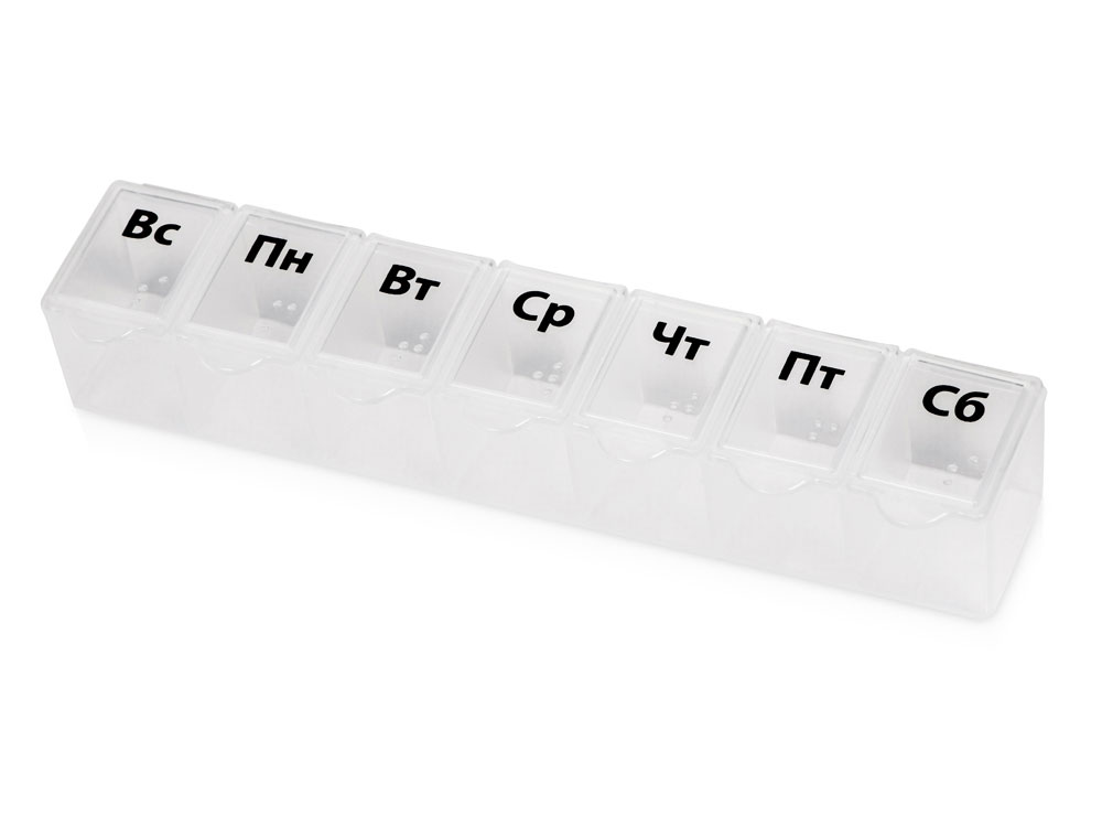 Таблетница с днями недели. Надписи продублированы шрифтом Брайля на английском языке. Каждый отсек оснащен крышкой с защелкой – содержимое не вывалится при тряске в машине или в сумке. Вы можете разместить на таблетнице свой логотип или другое изображение. Преимущества: · надежность хранения · отсеки подписаны по дням недели · удобно брать с собой в поездки