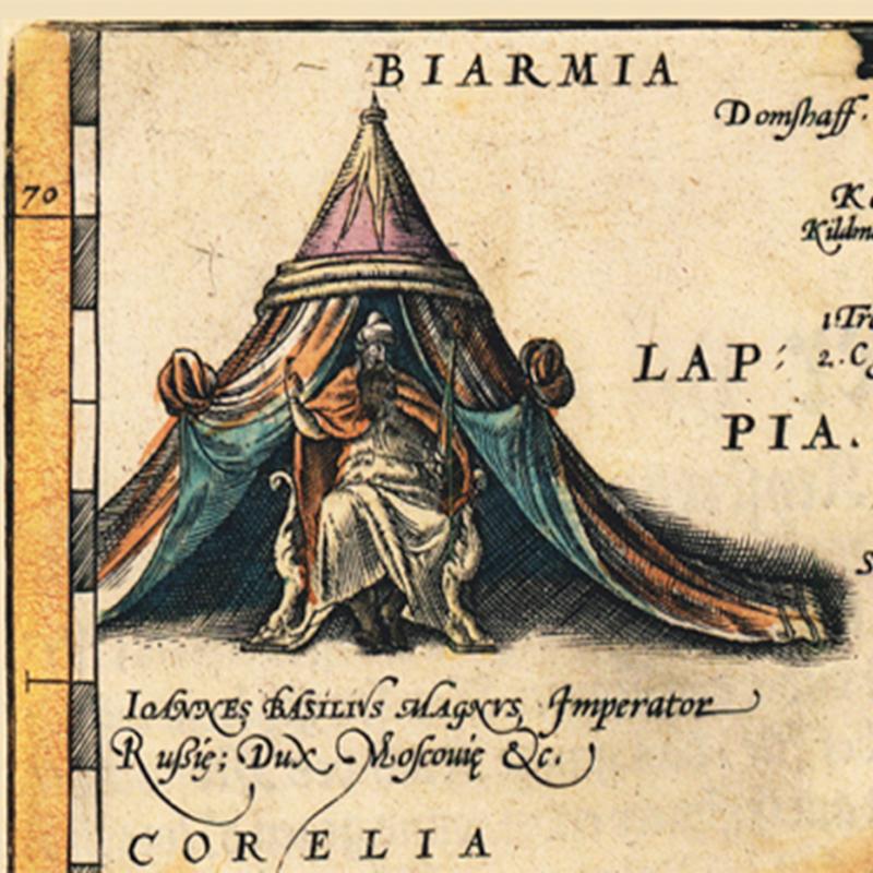 • В левом верхнем углу запечатлен император Иван IV Васильевич (Грозный), а под ним надпись: Ioannes Basilivs Magnus, Imperator Russie, Dux Moscovie - Иоанн Василевс Великий, Император России и князь Московский. Во второй половине XVI века в мире никого не называли императором, кроме русского царя.