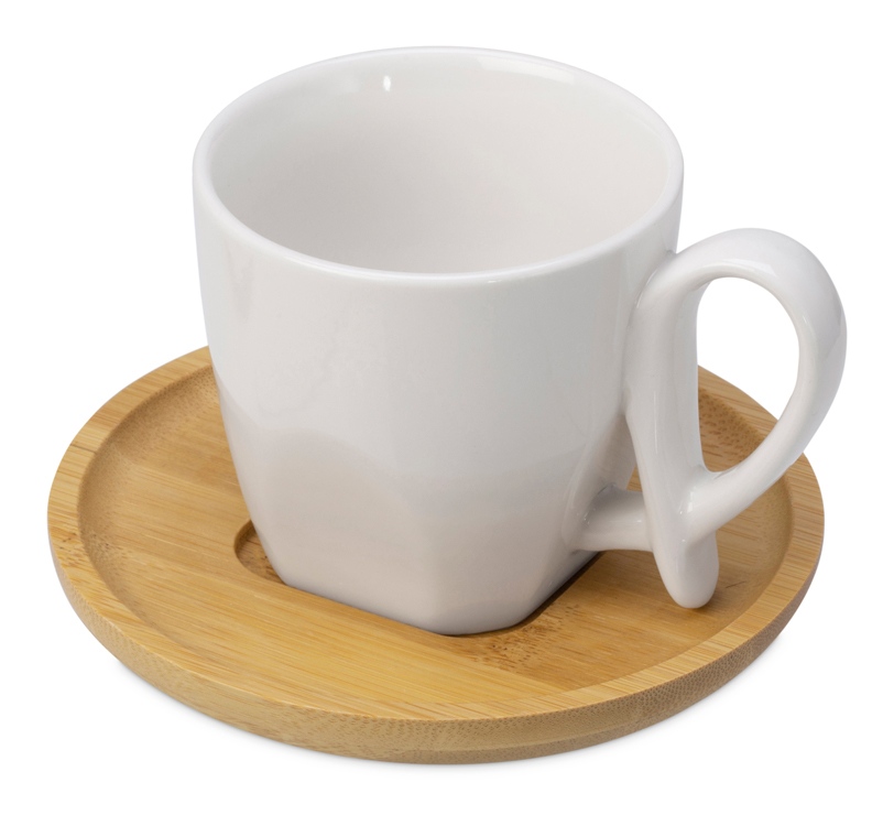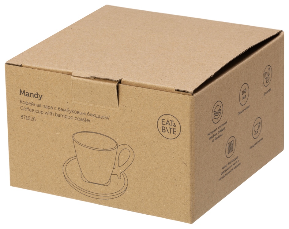 Чашка изготовлена из костяного фарфора, - более тонкого и изящного по сравнению с обычной глиняной керамикой, и прекрасно подойдёт для кофе (объём 160 мл). Бамбуковое блюдце имеет выемку для чашки, поэтому Mandy можно аккуратно разместить на столе, не занимая много места. Кофейная пара от бренда Eat&Bite смотрится эстетично и красиво из-за нестандартного дизайна - фигурной ручки чашки и квадратного донышка, которое точно подходит под выемку блюдца. - стильный и необычный дизайн; - объём чашки 160 мл; - костяной фарфор и бамбук; - компактное хранение;