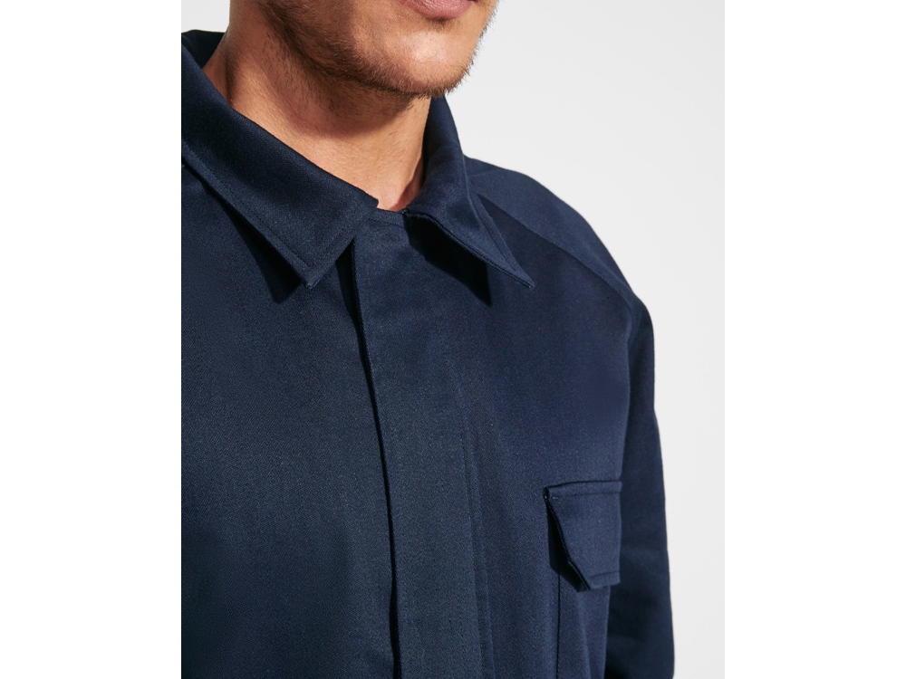 Прямой комбинезон. · Передний разрез с застежкой·молнией и застежкой·липучкой. · Левый нагрудный карман с клапаном и застежкой·липучкой. · Два боковых кармана с клапаном и застежкой на липучке. · Один боковой карман с клапаном и застежкой на липучке. · Регулируемые манжеты. · Задний карман с клапаном и липучкой. · Ткань с защитой от повышенных температур