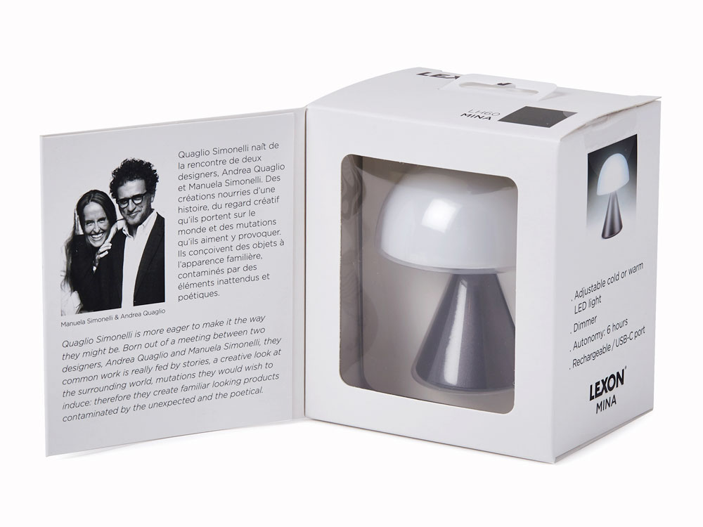 Mina — это лампа, идеально сочетающая в себе эстетику и функциональность. Её изящный силуэт гармонично впишется в любой интерьер, добавив лёгкий штрих современности вашей гостиной, офису, спальне или прикроватной тумбочке. Настоящая жемчужина дизайна, она притягивает взгляд, не перегружая пространство, и быстро становится неотъемлемой частью вашего интерьера. - Миниатюрная светодиодная лампа - Холодный или теплый белый свет - Регулятор яркости с памятью - Срок службы батареи: до 12 часов (тестировано при яркости 75%) и температуре в помещении 22°C - Время зарядки: 2 часа - Заряжается через порт USB-C / кабель входит в комплект
