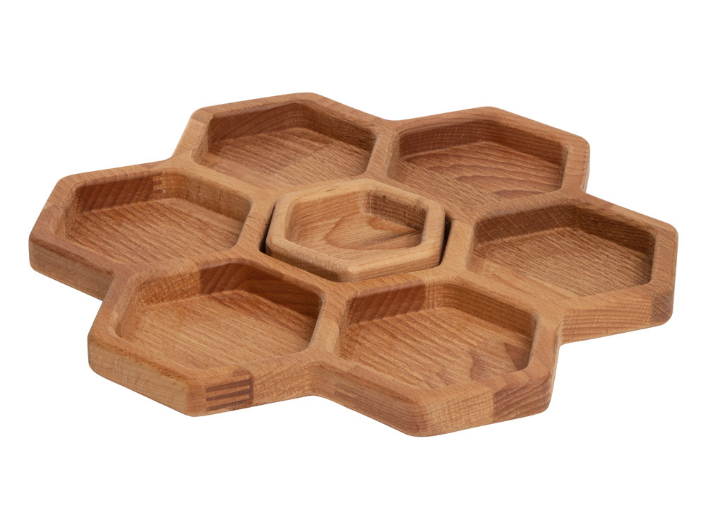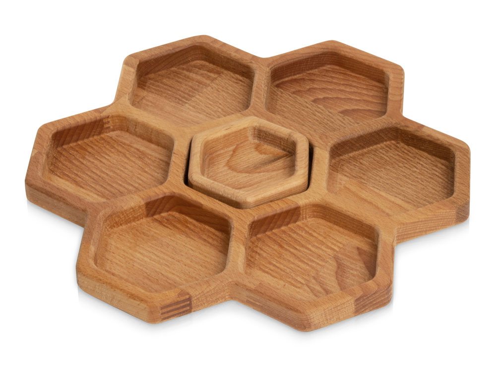 Менажница выполнена в виде семи сот для разных видов закусок — за бонусную дополнительную отвечает съемная сота-соусница, в которую можно залить мед или любимый соус. Менажница выполнена из бука и пропитана маслом, что обеспечивает изделию свежий вид. Советуем регулярно смазывать дерево пищевым маслом, чтобы изделие дольше радовало вас. - натуральный бук - съемная соусница - интересный дизайн - вариант для подачи 8 видов закусок - можно использовать для сервировки закусок