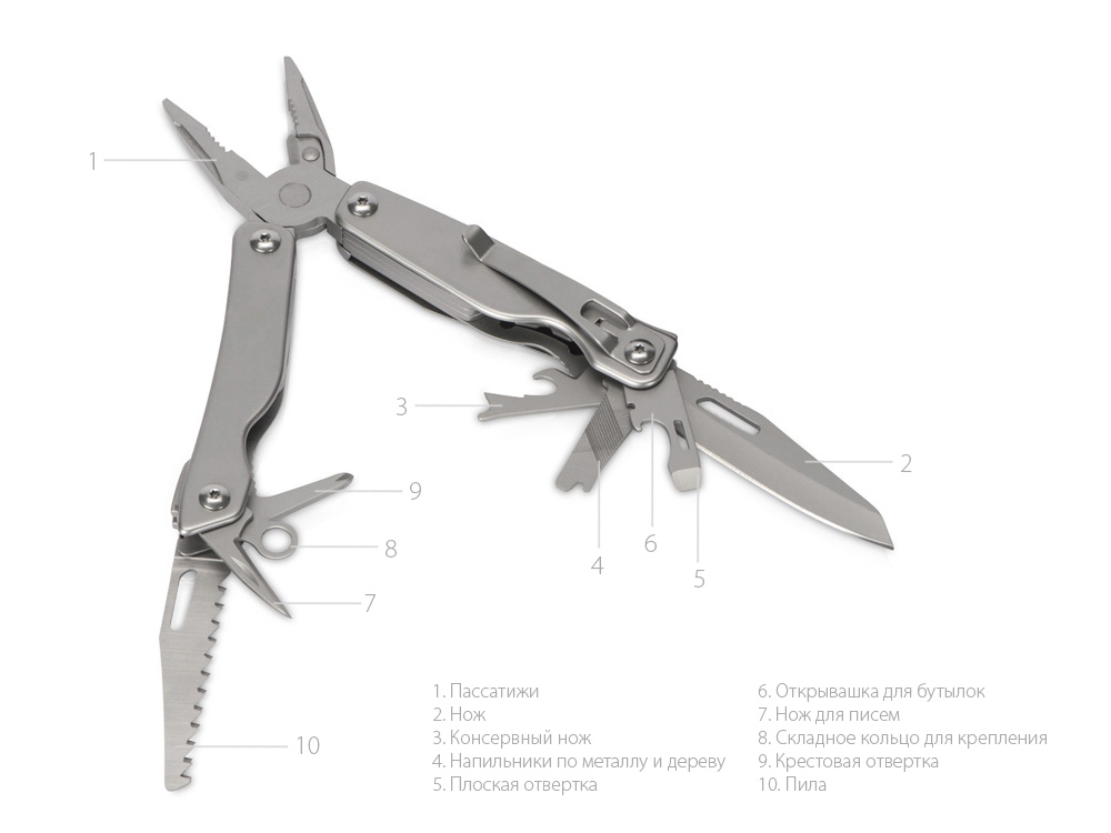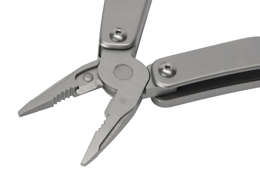 Мультитул-пассатижи Combo бренда roq выполнен из нержавеющей стали. Матовое покрытие позволяет сделать брендирование более заметным. Чтобы не потерять инструмент, его можно прикрепить клипом за ремень или подвесить за складное кольцо. Поставляется в индивидуальной коробке вместе с чехлом. • матовая текстура — фон для яркого нанесения • чехол в комплекте • пассатижи и другие важные инструменты помогут и в повседневной жизни, и в походе Функции: 1. Пассатижи 2. Нож 3. Консервный нож 4. Напильники по металлу и дереву\пилка для ногтей 5. Плоская отвертка 6. Открывашка для бутылок 7. Нож для писем 8. Складное кольцо для крепления 9. Крестовая отвертка 10. Пила