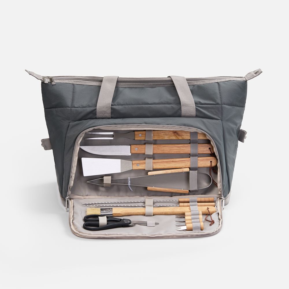 Объемная стильная и эргономичная термосумка вместит в себя все заготовленные овощи и мясные продукты, а также сохранит их температуру до 3 часов. Покрытие с водоотталкивающим эффектом защитит содержимое от внезапного дождя, а продуманная система хранения позволит надежно зафиксировать каждый инструмент в сумке при транспортировке.