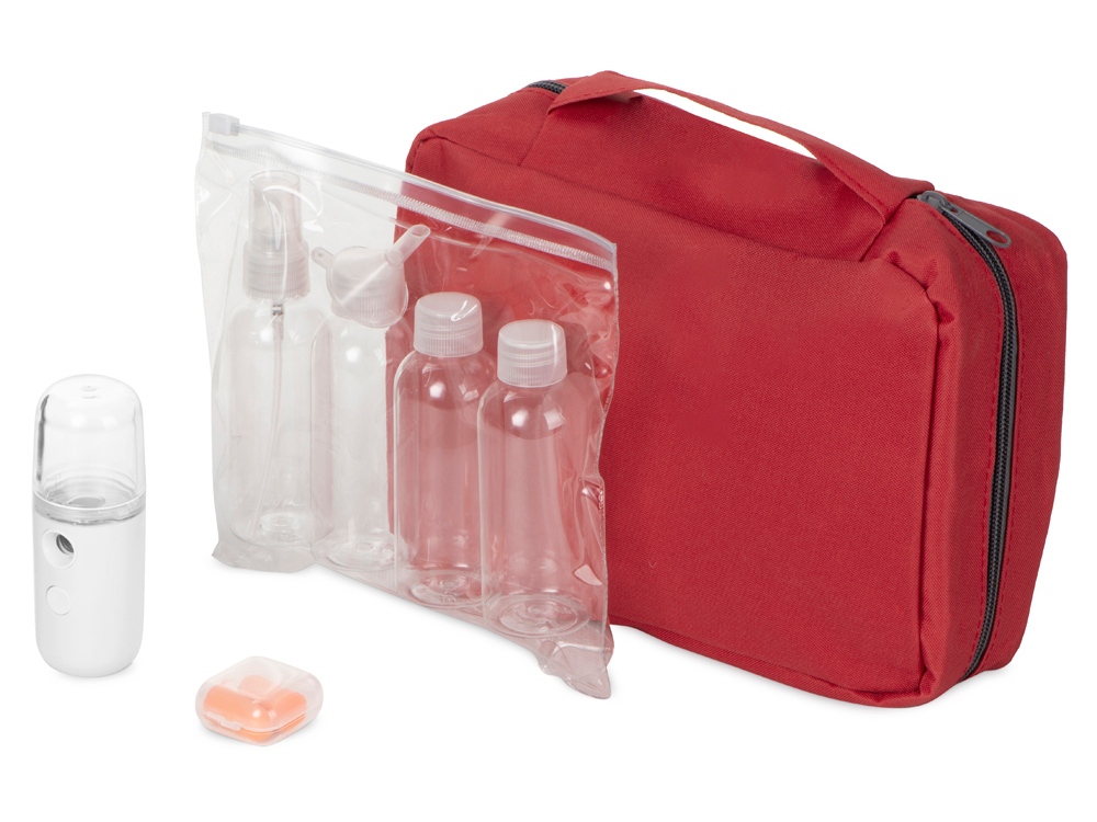 Практичный, легкий и компактный набор для путешествий. Аккуратный несессер можно взять в салон самолёта как ручную кладь, поэтому всё необходимое будет всегда под рукой, например, беруши, которые входят в состав сета. Флакончики объёмом 80 мл подойдут для шампуня, геля для душа и других косметических средств, один флакон оснащён распылителем. Бутылочки упакованы в прозрачный непромокаемый пакет на zip-lock застёжке, который дополнительно защищает багаж. Портативный увлажнитель для лица быстро освежит кожу и поможет сохранять ее увлажненной даже в долгих перелетах. - несессер подходит для ручной клади; - увлажнитель заряжается через usb провод (в комплекте); - всё, что нужно для путешествия на поезде или в самолёте; - время работы увлажнителя от внутреннего аккумулятора — до 3 часов.