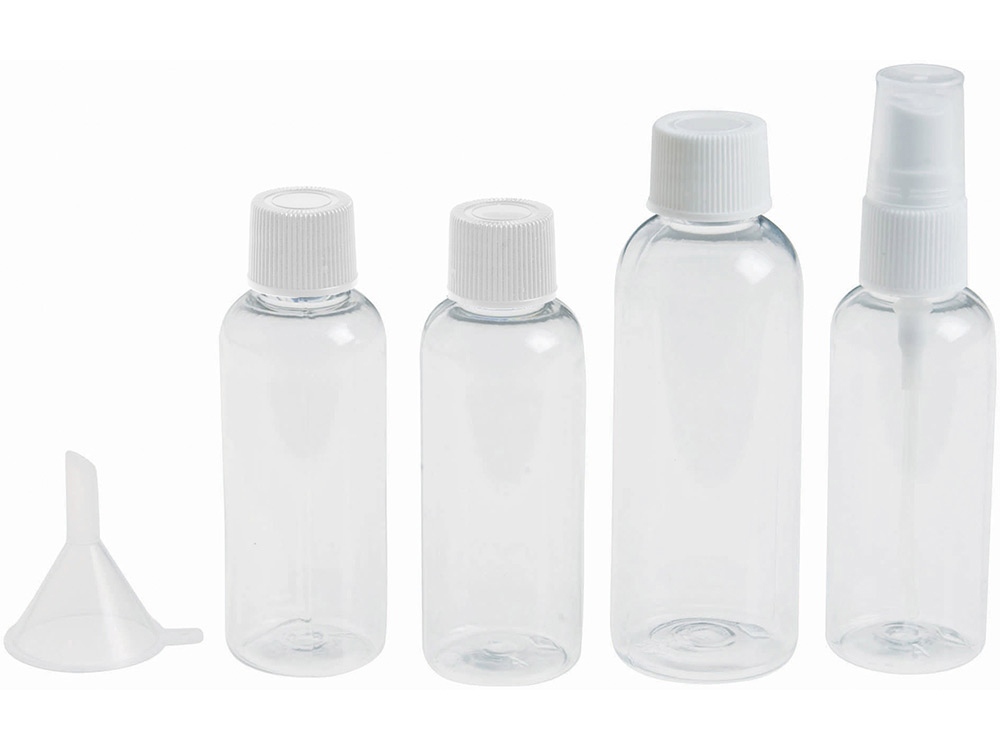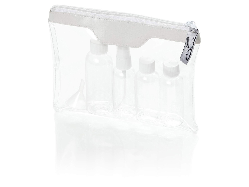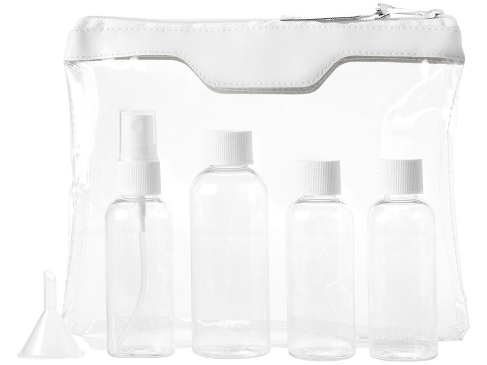 Одобренный дорожный набор бутылок для полетов Munich. Сумка для туалетных принадлежностей, которую можно брать в самолет. Включает 2 бутылки по 50 мл, 1 бутылку на 90 мл, 1 пульверизатор и воронку. Бутылки, пульверизатор и воронка упакованы в полиэтиленовый кулек отдельно от чехла. ПВХ.