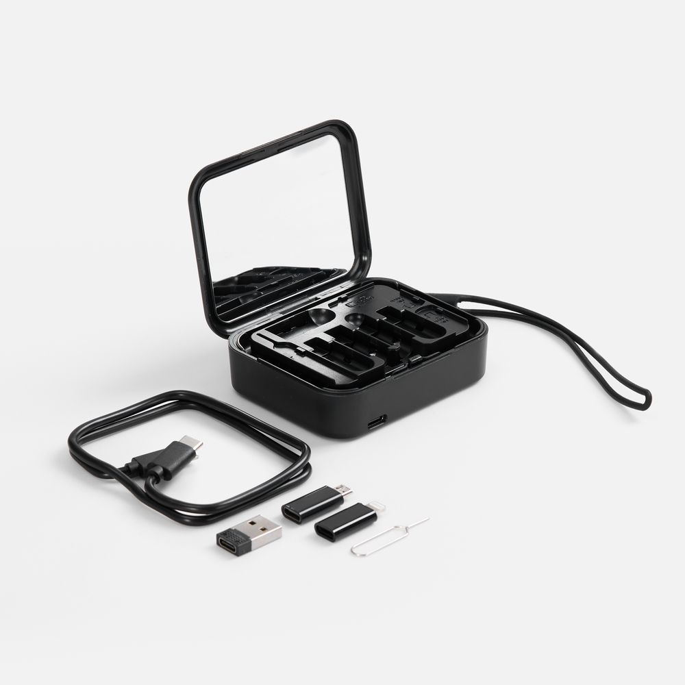 - аксессуары для чистки гаджетов: щетка с наклонной щетиной, перо для чистки со щеткой для наушников, насадка для чистки футляра от наушников, двусторонняя насадка для чистки разъёмов зарядки, щетка с мягкой щетиной