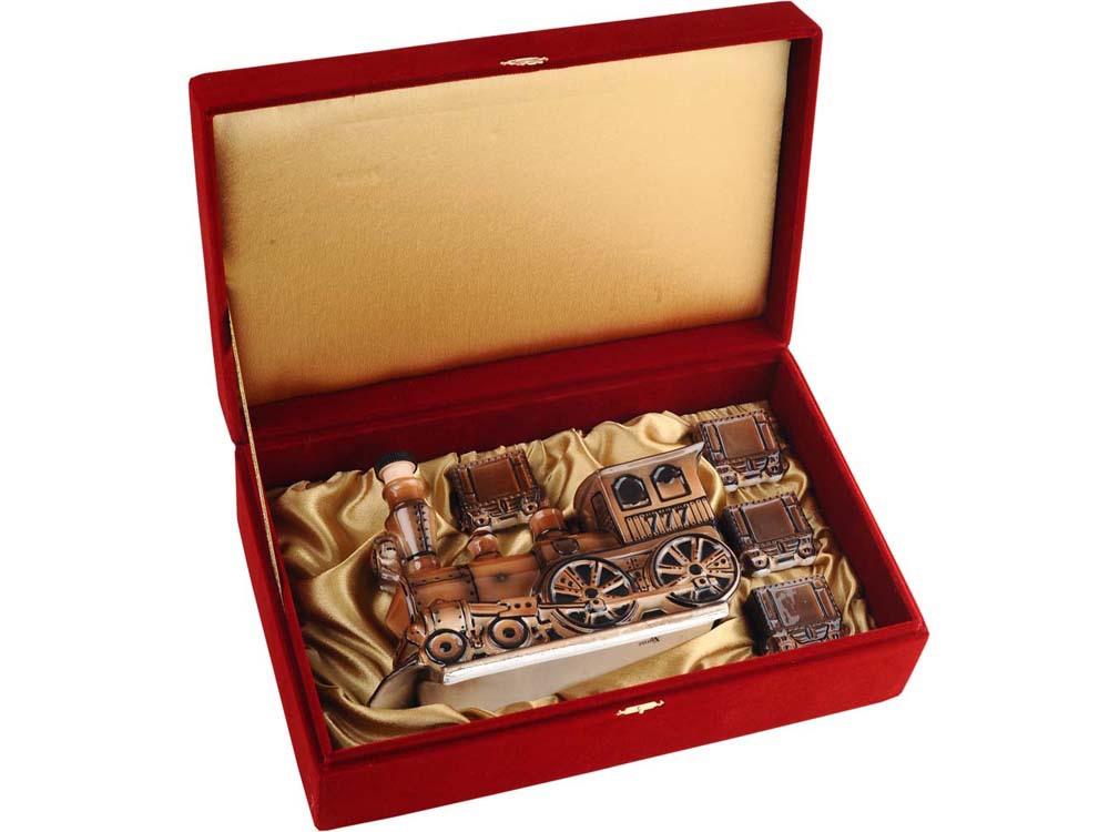 Если Ваша деятельность связана с железной дорогой, Вам будет особенно приятно видеть на своем праздничном столе набор для водки в виде паровоза и вагончиков. Паровоз выступает в роли штофа, а вагончики - в роли стопок. Причем это не массовое производство, а авторская работа. Внимание! Данное изделие относится к категории повышенной хрупкости. Для обеспечения его целостности и безопасной транспортировки настоятельно рекомендуется использование обрешетки. Обрешеточная упаковка является обязательной при доставке, и компания Oasis не несёт ответственности за повреждения, возникшие в результате ненадлежащей упаковки или транспортировки без обрешетки.