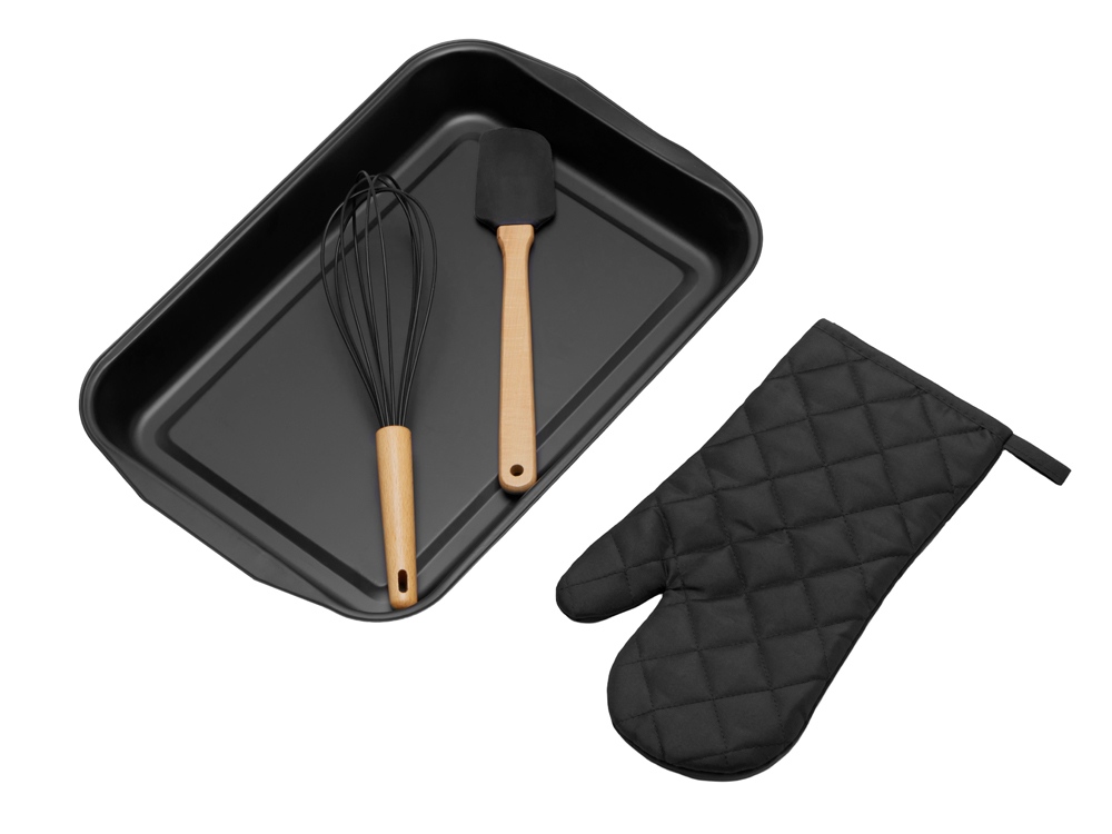| Комплектность | противень 41 х 27,5 х 4,3 см (внутр. размер 33 х 22 см) , рукавица 16 х 29,5 см, лопатка 28 см, венчик 30 см |