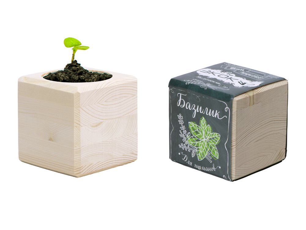 Экокуб – это современный набор для выращивания растения в домашних условиях. Вы получаете все необходимое от семян и грунта до подробной инструкции по уходу за сеянцем. Также экокуб станет отличным украшением вашего интерьера, ведь он сделан из натурального дерева и будет радовать вас ни один месяц. Экокуб Базилик позволит самостоятельно и без каких-либо хлопот вырастить ароматную зелень, которая, к тому же, украсит интерьер, наполнив помещение свежим бодрящим ароматом. Небольшой однолетний куст в зависимости от сорта может иметь стебли и листву различной окраски, характера и интенсивности аромата. Наиболее распространенным и универсальным вариантом представляется зеленый базилик с сочной листвой. Поскольку данное растение родом из тропиков и субтропиков, для его успешного выращивания необходимо позаботиться о достаточном количестве света, тепла, и обеспечить увлажнение почвы и листвы. Обо всем остальном уже побеспокоился производитель - достаточно высадить семена в подготовленный питательный грунт экокуба, увлажнить и ждать скорых всходов. При желании побеги можно рассадить.