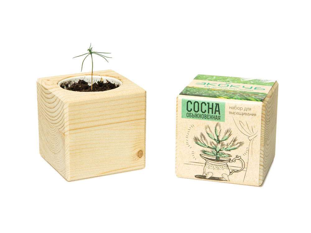 Экокуб – это современный набор для выращивания растения в домашних условиях. Вы получаете все необходимое от семян и грунта до подробной инструкции по уходу за сеянцем. Также экокуб станет отличным украшением вашего интерьера, ведь он сделан из натурального дерева и будет радовать вас ни один месяц. Экокуб Сосна обыкновенная - это прекрасная возможность вырастить в домашних условиях уникальное по свойствам дерево, которое сумеет заменить и врача, и косметолога, и бионерготерапевта, а также украсить и оживить интерьер жилища оригинальным живым декором, который сегодня более чем популярен. Не стоит опасаться того, что для сосны потребуется много места. Выращиваемая в небольшом горшке, декоративная сосна не вырастет выше метра. При этом стройное деревце с шаровидной кроной невероятным образом способно адаптироваться к условиям произрастания. Это относится как к составу почвы, так и условиям температуры и влажности. Конечно, зимние температуры для сосны по возможности должны бать ниже летних, хотя неприхотливая сосна может простить и изотермию. Не зря это растение получило широкое распространение по всему миру, практически во всех климатических зонах. Деревце растет медленно, при этом не требуя ежегодного пересаживания. Зато ощутимую пользу начинает приносить сразу же с появлением молодой хвои.
