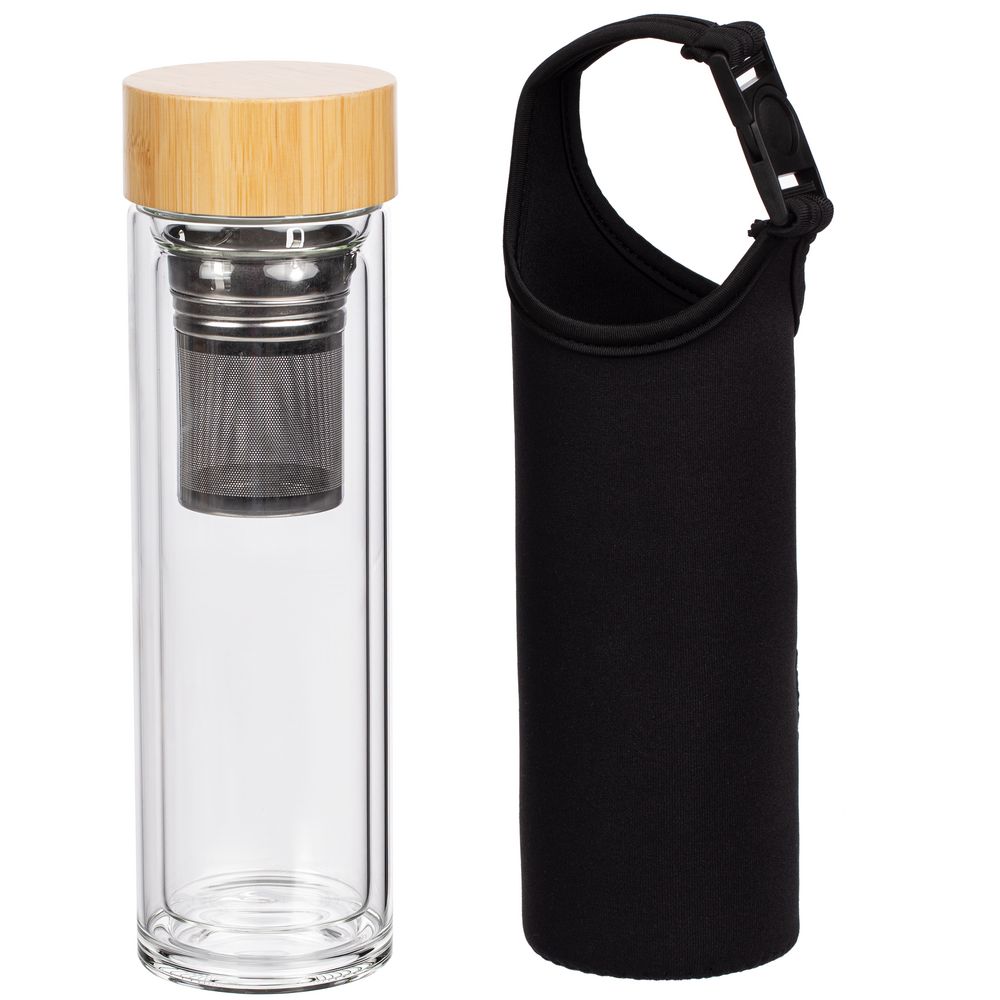 Материал дерево; бутылка - боросиликатное стекло, чехол - неопрен; ситечко - нержавеющая сталь; крышка - бамбук, пластик; подставка - бамбук; игрушка-антистресс - дерево; коробка - микрогофрокартон