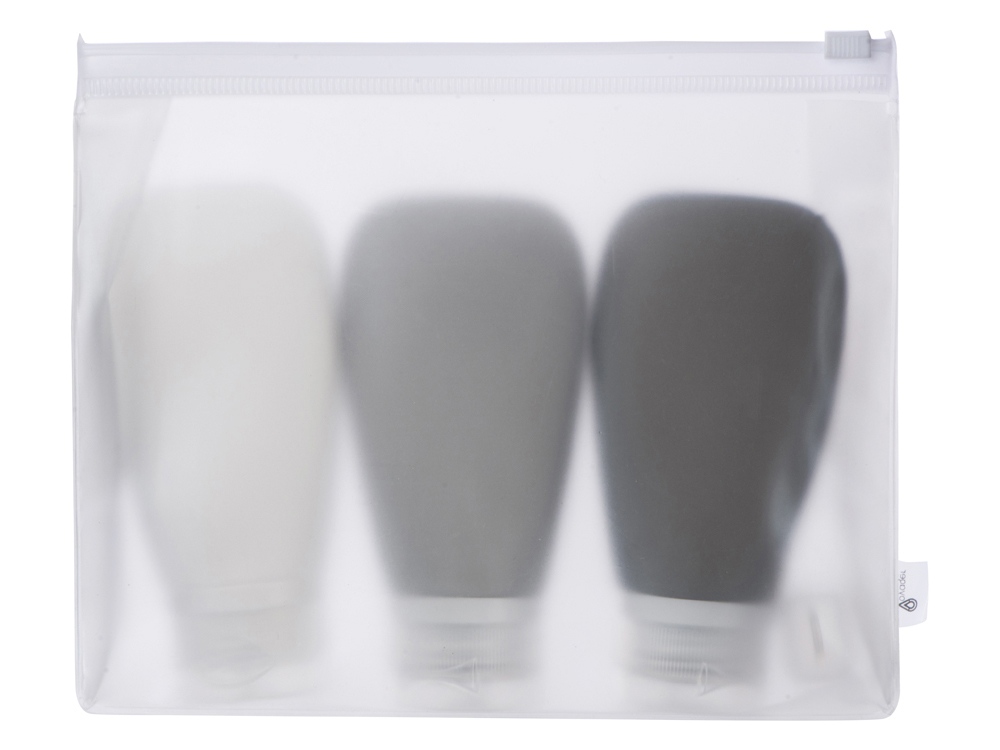 Этот набор избавит вас от необходимости брать с собой в путешествие большие и тяжелые флаконы, например, с шампунем, кондиционером и гелем для душа. В наборе как раз три силиконовых ёмкости по 90 мл, все они разного цвета, что поможет с легкостью идентифицировать каждый продукт. Также в On air входит колпачок для зубной щётки. Всё это вы можете сложить в специальную прозрачную и лёгкую косметичку из материала EVA на застёжке zip-lock и не бояться, что что-то прольётся. • Три ёмкости из силикона разного цвета • EVA-косметичка • Застёжка zip-lock • Колпачок для зубной щётки