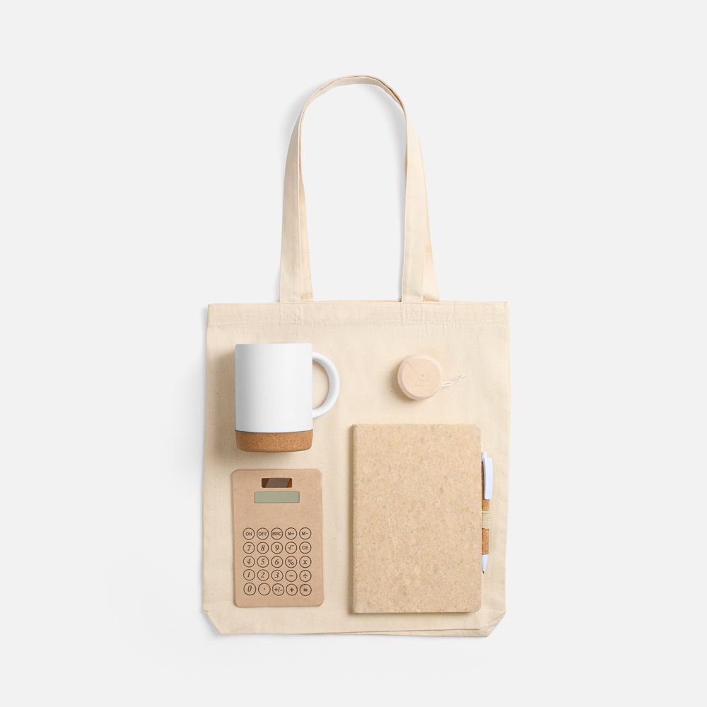 | Материал | блокнот - пробка; кружка - каменная керамика, подставка - пробка; калькулятор - картон; сумка - хлопок 100%, плотность 210 г/м²; саржа; игрушка-антистресс - дерево; ручка - пластик, пробка |