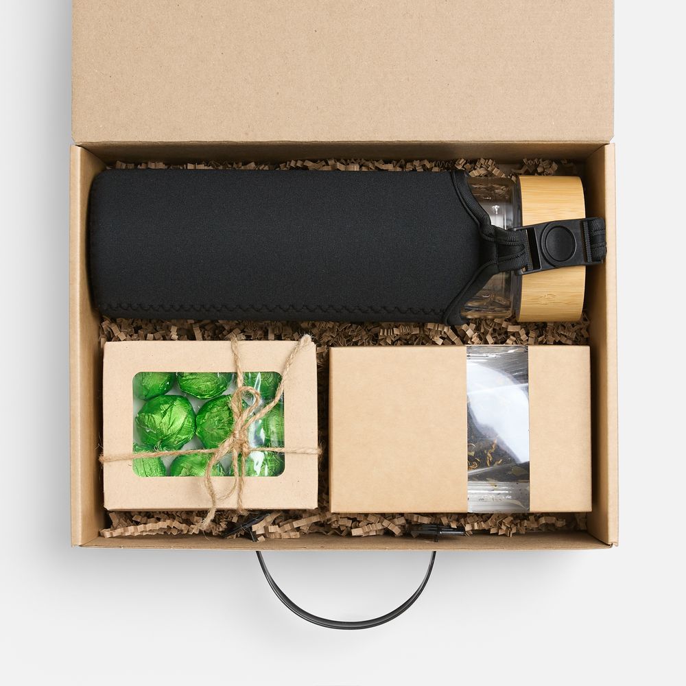 Материал бутылка - боросиликатное стекло, нержавеющая сталь, бамбук, неопрен; коробка - картон, пластик