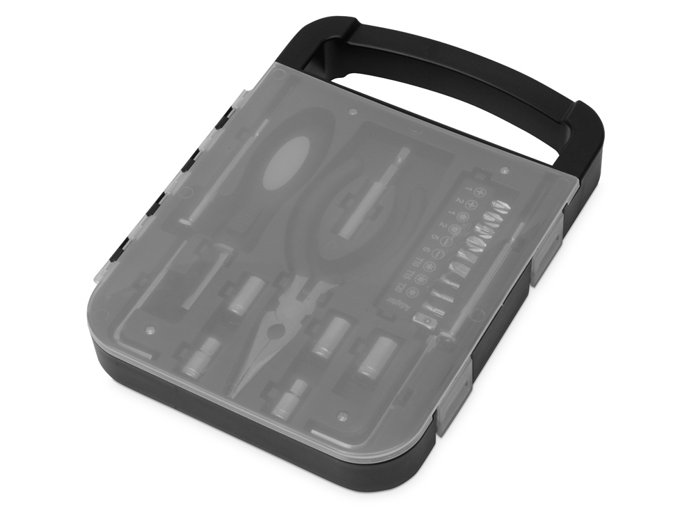 Набор инструментов в удобном пластиковом кейсе, состоит из 6 инструментов и 16 насадок: - Плоскогубцы - Отвертка с удлиннителем - 2 шестигранника - 2 тонких отвертки - 6 головок гаечных торцевых ключей (6/7/8/9/10 мм) - 9 бит + адаптер
