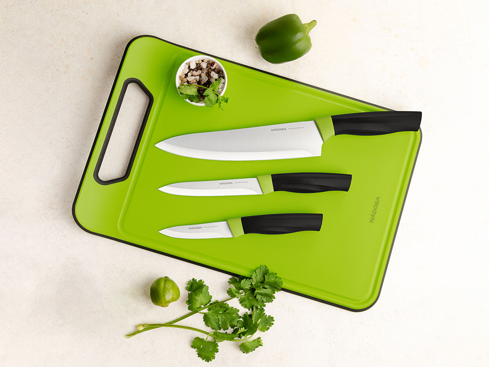 Набор из 3 ножей с доской NADOBA серии Olivia состоит из: нож овощной, 9 см, нож универсальный, 12,5 см, нож поварской, 20 см и разделочной доски 37,5х25х0,8 см. Ножи выполнены из высококачественной нержавеющей стали с высоким содержанием углерода. Благодаря этому нож обладает высокой твердостью 52-54 HRC по шкале Роквелла и превосходными антикоррозийными свойствами. За счет пятигранного профиля и правильной толщины лезвий ножи обладают идеальным балансом и длительное время не требуют заточки. Разделочная доска с оптимальной толщиной 8 мм из пищевого пластика высокоустойчива к истиранию и износу, не впитывает запахи и легко моется. Углубление, которое располагается по периметру разделочной доски, удерживает жидкость от продуктов и сохраняет стол в чистоте. Изделия можно мыть в посудомоечной машине. Гарантия на набор Olivia 3 года.