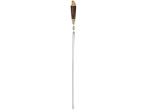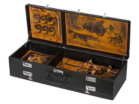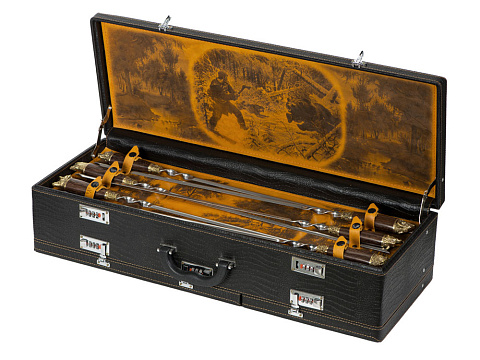 Кейс из сплит-кожи, с повышенной износостойкостью, с картиной, внутренняя отделка натуральная кожа с художественным выжиганием. В комплекте: Стопка 50 мл- 6 шт. Нож Тополь - 1 шт. Нож Мясник-2 - 1 шт. Нож выкидной - 1шт. Шампура 68 см (нерж. сталь), ручка орех, бронзовое литье - 6 шт. Тарелки d19,5 х 2 см - 6 шт. Шампура d2,5 х 68 см - 6 шт. Ложки - 6 шт. Вилки - 6 шт.