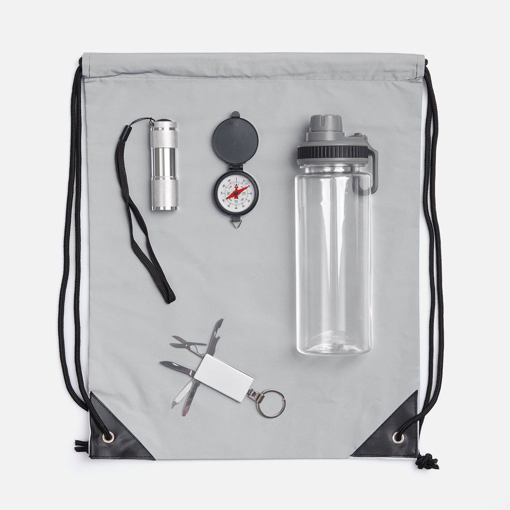 Материал рюкзак - полиэстер 35%, хлопок 65%; бутылка - пластик, пищевой; брелок-мультитул - металл; фонарик - алюминий; компас - АБС-пластик