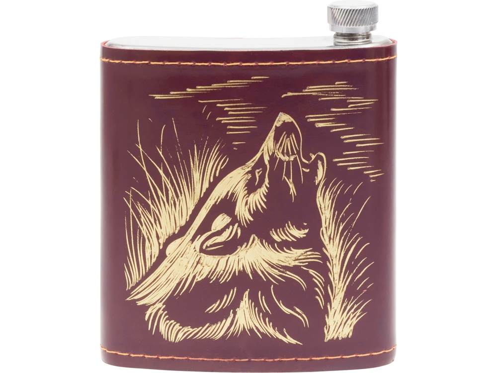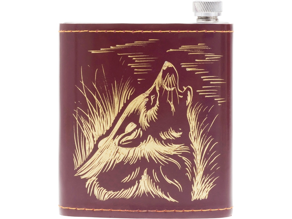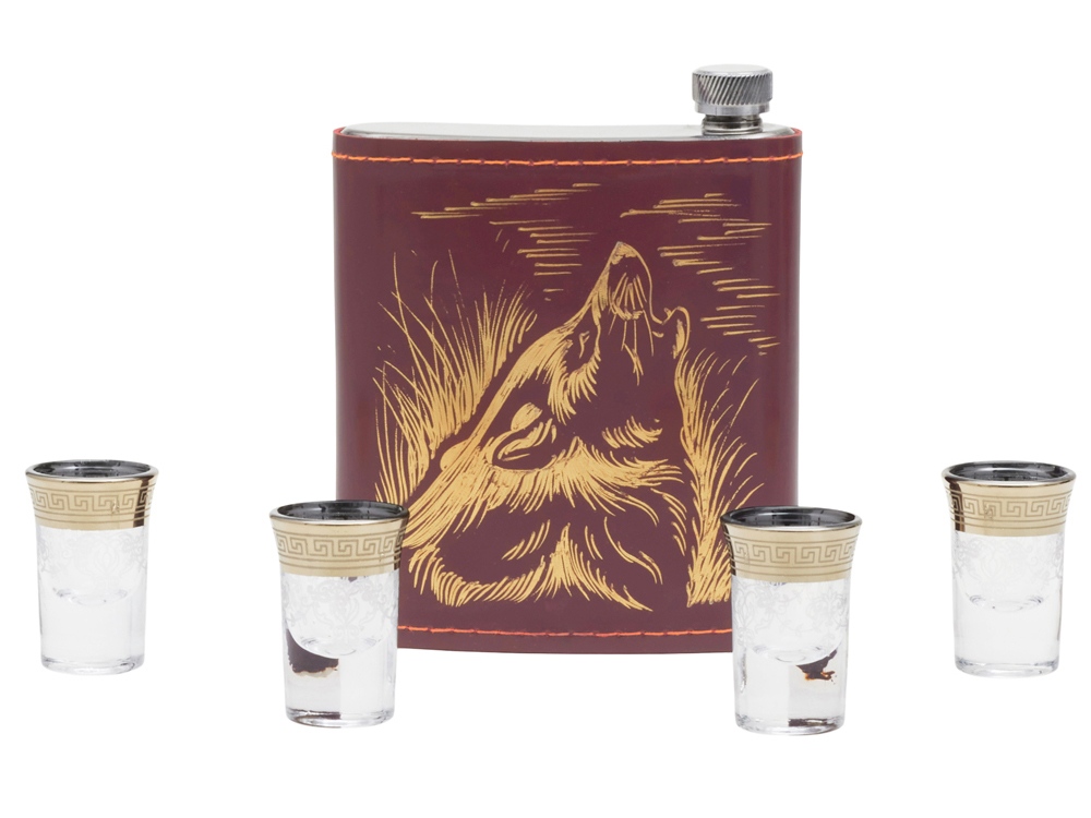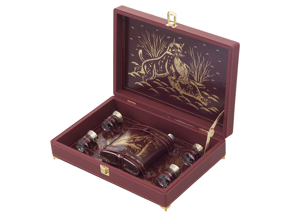 Кейс из сплит-кожи, с повышенной износостойкостью, внутренняя отделка натуральная кожа с художественным выжиганием. В комплекте: Стопка 15 мл- 4 шт. Фляга 500 мл- 1 шт.
