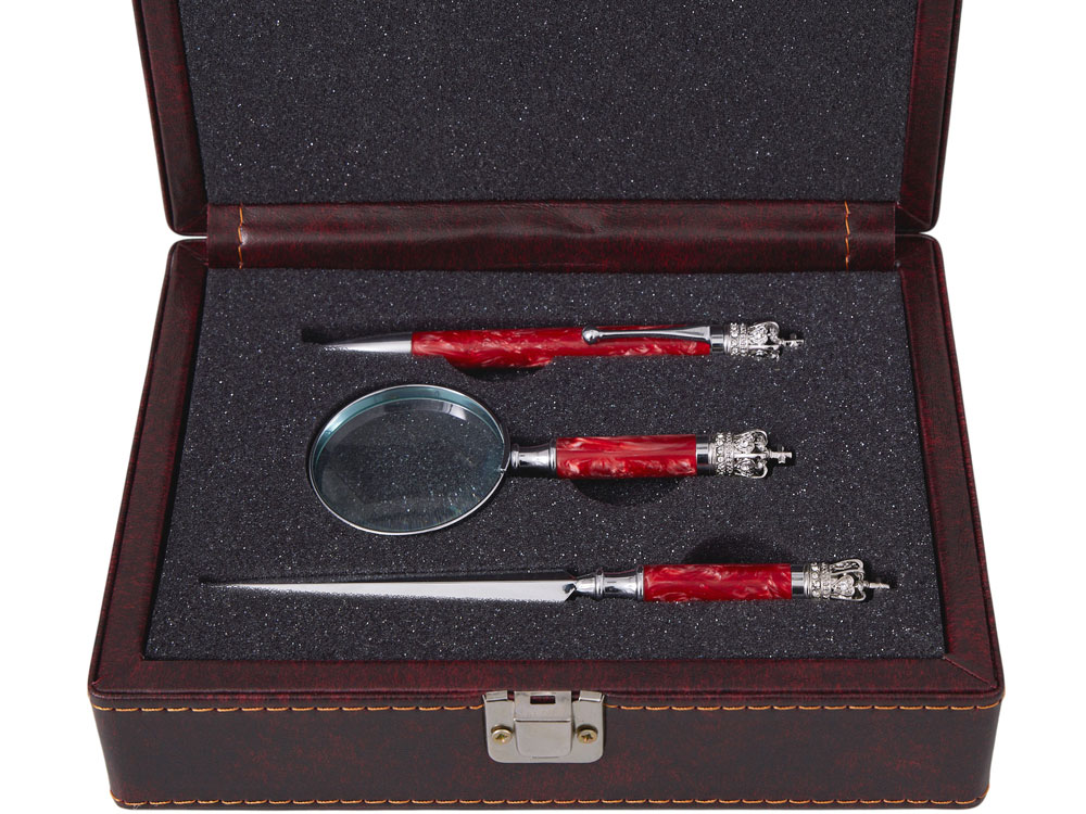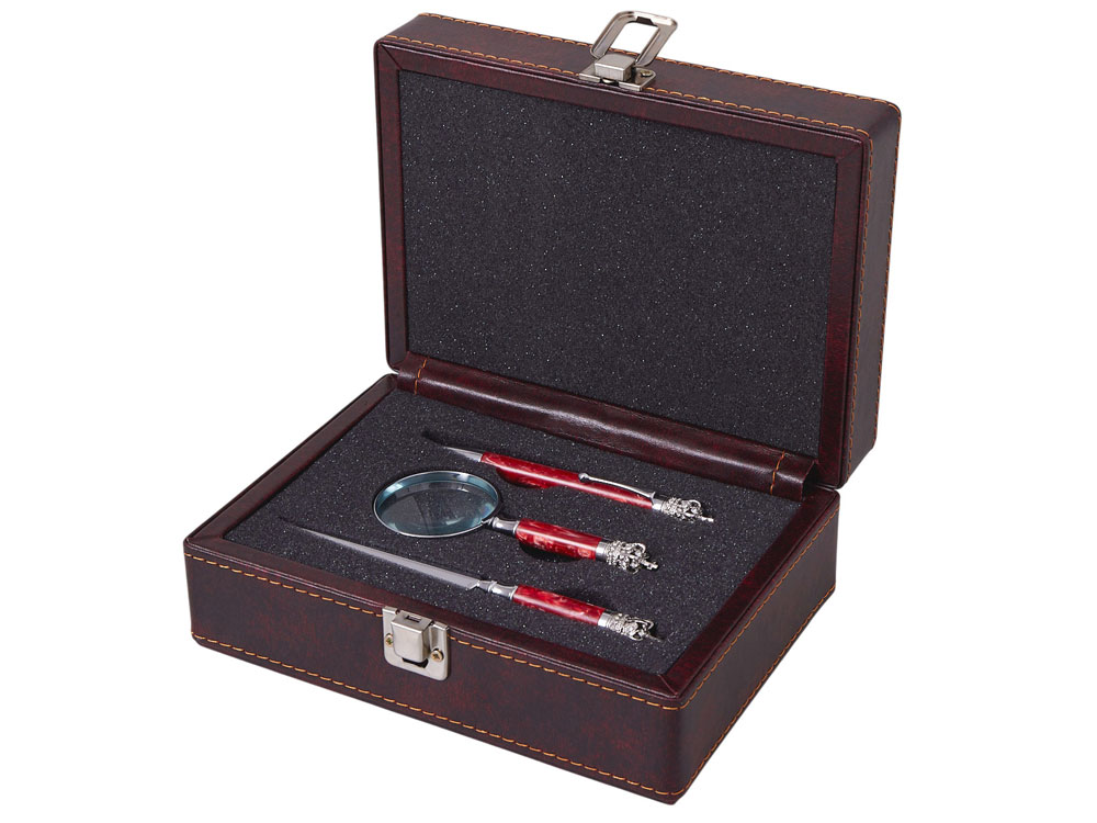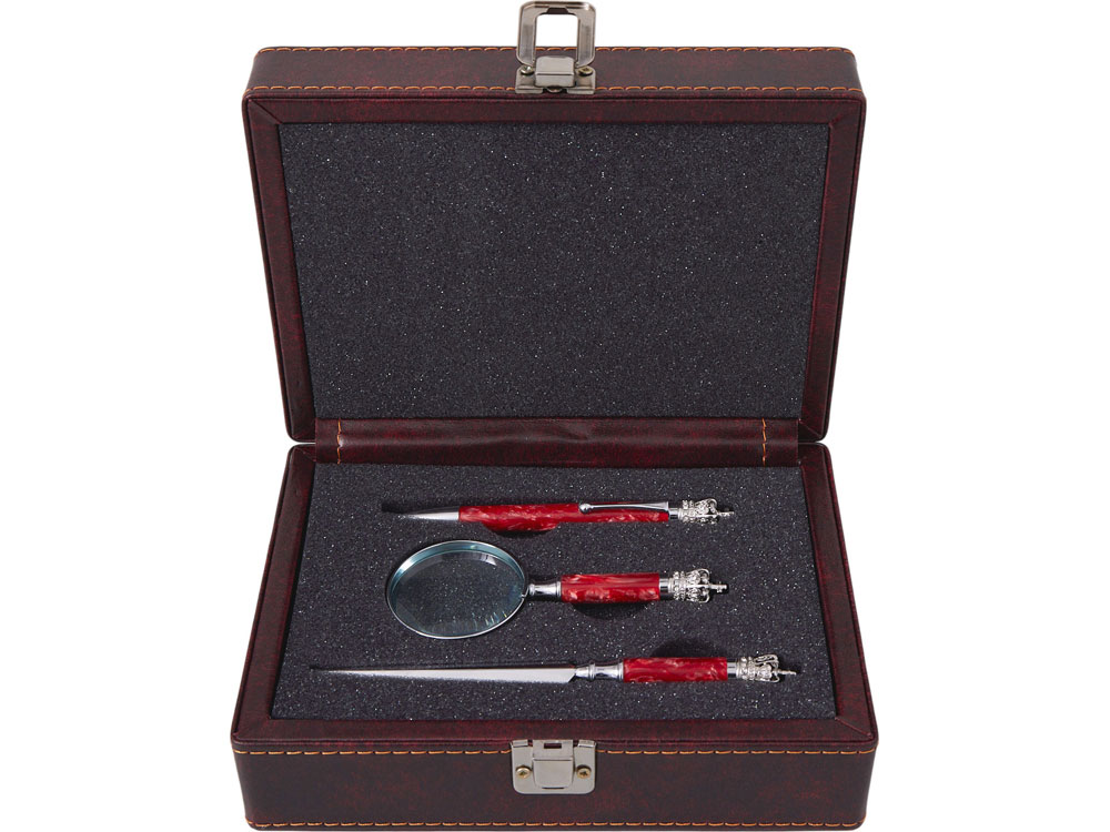 Комплектность ручка шариковая d1,1 х 13 см, лупа d5 х 12,1 см, нож для бумаг d1,1 х 16,5 см