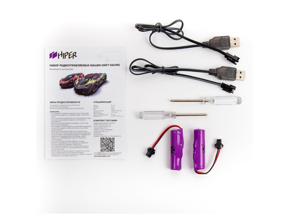 HIPER Drift Racing полноприводные радиоуправляемые машины, оснащенные всенаправленными-роликовыми колёсами и светодиодной подсветкой кузова. Увлекательный процесс управления понравится не только детям, но и взрослым. И все это будет сопровождаться звуковыми эффектами работающего мотора, яркой подсветкой, особенно эффектно заезды смотрятся в темноте. ВПЕЧАТЛЯЮЩИЕ ХАРАКТЕРИСТИКИ Благодаря всенаправленным-роликовым колёсам Mecanum HIPER Drift Racing может ехать боком и по диагонали, а также вращаться на 360 градусов. Помимо роликовых колёс автомодели обладают ёмкими аккумуляторами, которые обеспечивает до 25 минут работы на одном заряде. Особенности: • Масштаб 1:24 • 2 машинки и 2 пульта • Максимальная скорость до 10 км/ч • Всенаправленные-роликовые колёса Mecanum • Вращения на 360 градусов • Полный привод • Кнопка демонстрации • Время игры до 25 мин • Кнопка демонстрации • Световые эффекты Технические характеристики: Радиус действия: до 35 метров Длина машины – 21 см Ширина машины – 10 см Высота машины – 6 см Аккумулятор : Li-Ion 3.7В / 500 мАч Время игры: ~ 25 мин Время зарядки: ~ 120 мин
