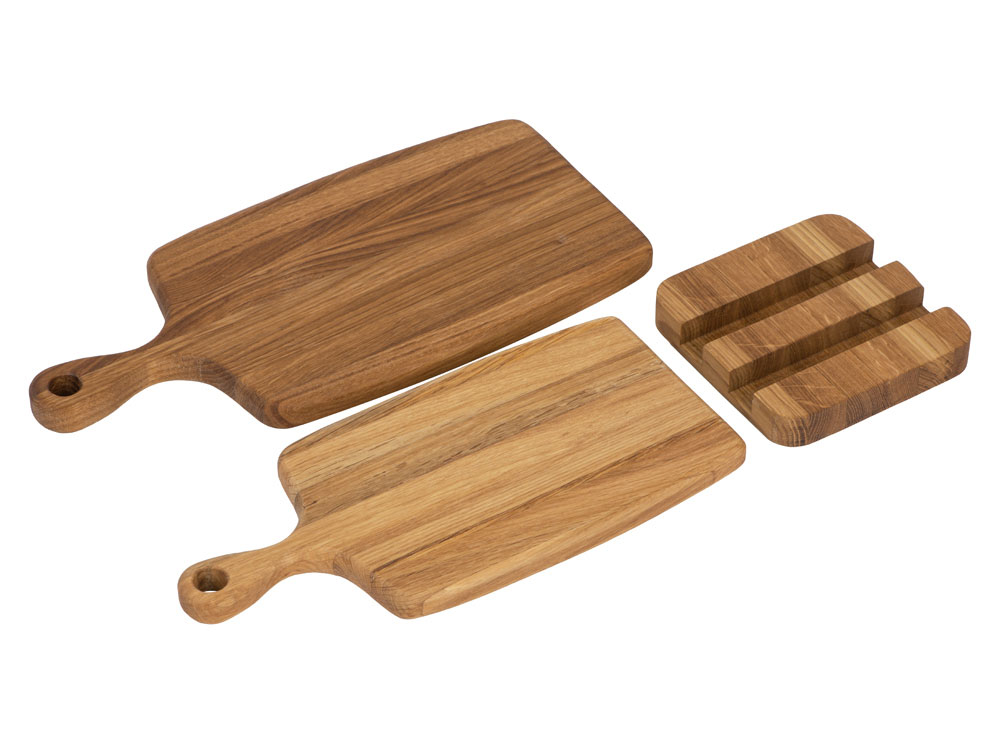 Набор от Eat&Bite состоит из двух разделочных досок из натурального дуба, а также подставки для них. Доски обработаны пищевым маслом, которое не дает древесине растрескаться и помогает поддерживать свежий вид. - удобная подставка для хранения в комплекте - натуральный дуб — долговечный материал, приятный с эстетической точки зрения - не замачивать в воде, не использовать в посудомоечной машине, не использовать в СВЧ-печи - поставляется в крафт-коробке