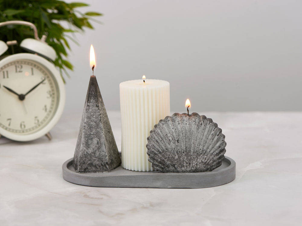 Этот набор из трех ароматических свечей непременно понравится приверженцам минимализма и стилей хай-тек, лофт, эко и скандинавского. Лаконичная геометрия, сочетающаяся с природным дизайном ракушки, натуральные молочный и неоднородный серый оттенки и подставка из гипсобетона смотрятся естественно, стильно и ненавязчиво. Благородный аромат черного перца и кожи, одновременно свежий и терпкий, подарит ощущение комфорта и уверенности. Свечи на 80% изготовлены из натуральных соевого и кокосового воска, не токсичны при горении и не вредны для дыхания. После того как свечи прогорят, подставку можно использовать для пало санто или других благовоний, а также для хранения различных мелочей или ювелирных украшений. - Минималистичный дизайн - Многофункциональная подставка из гипсобетона - Экосостав - Ручная работа