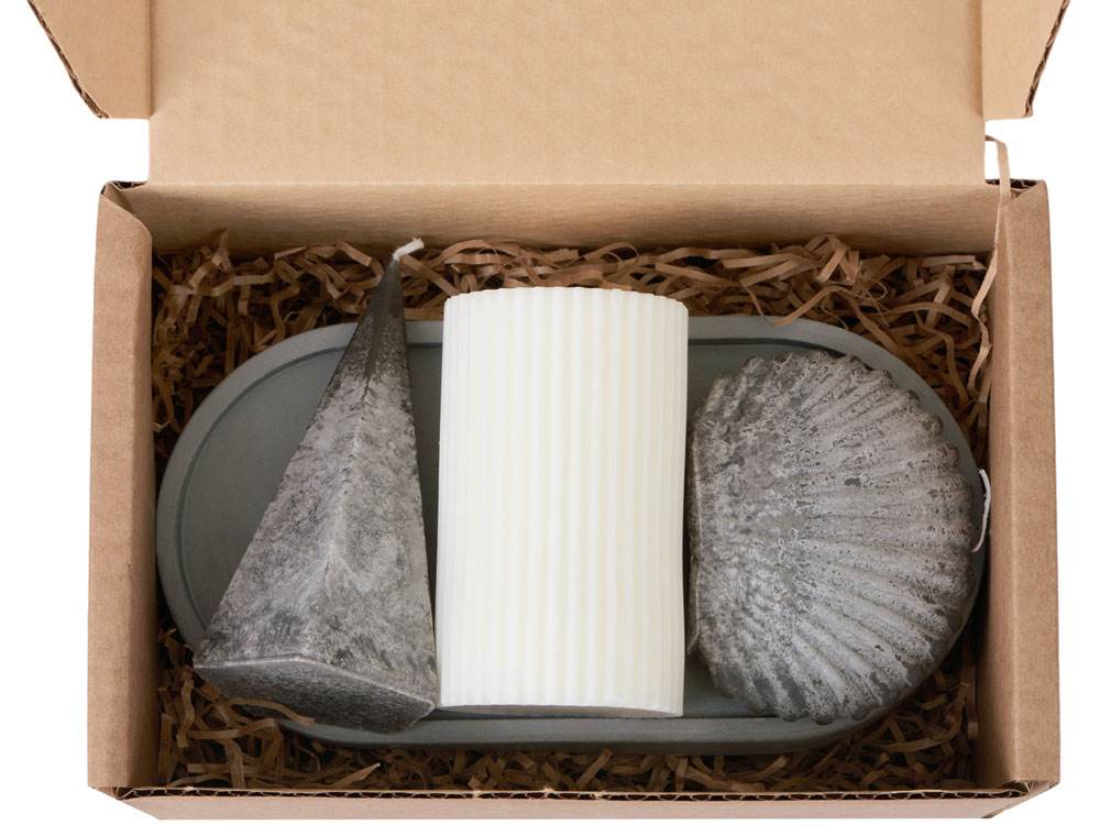 Комплектность свеча столбик, свеча пирамида, свеча ракушка, подставка гипсобетон, упаковочный материал