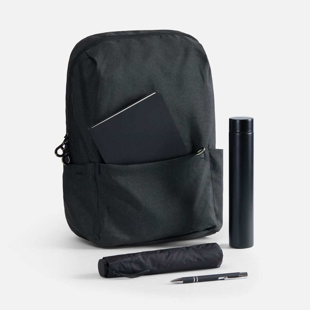 | Материал | рюкзак - полиэстер, 300D; зонт - полиэстер, 300T; спицы - стеклопластик; ручка - прорезиненный пластик; бутылка - нержавеющая сталь, 304 внутри, 201 снаружи; матовое покрытие; крышка - пластик; ручка - металл; покрытие софт-тач |