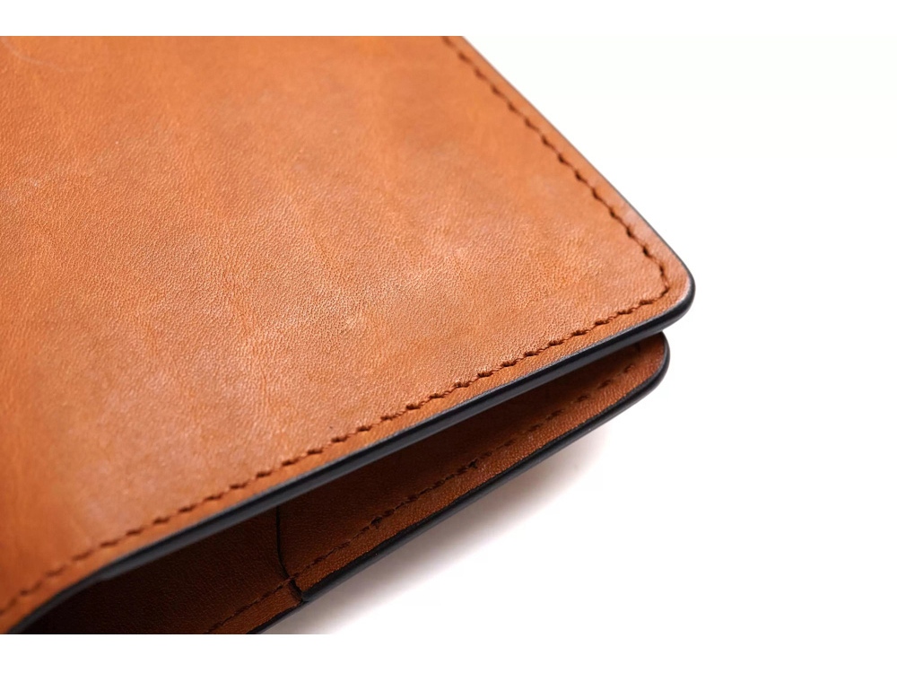 Классическая обложка из дублированной кожи, прокрашенные края, аккуратный шов, прорези для четырёх карт, место для паспорта и документов на машину.