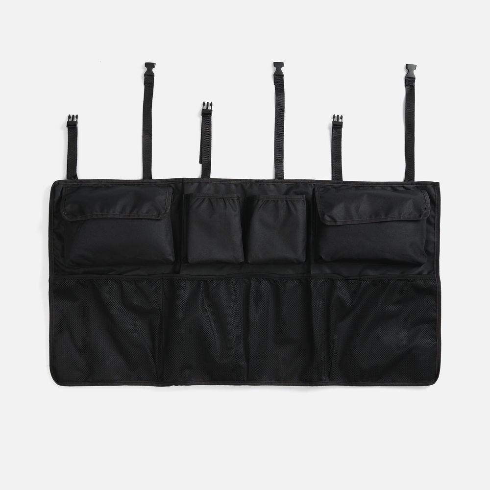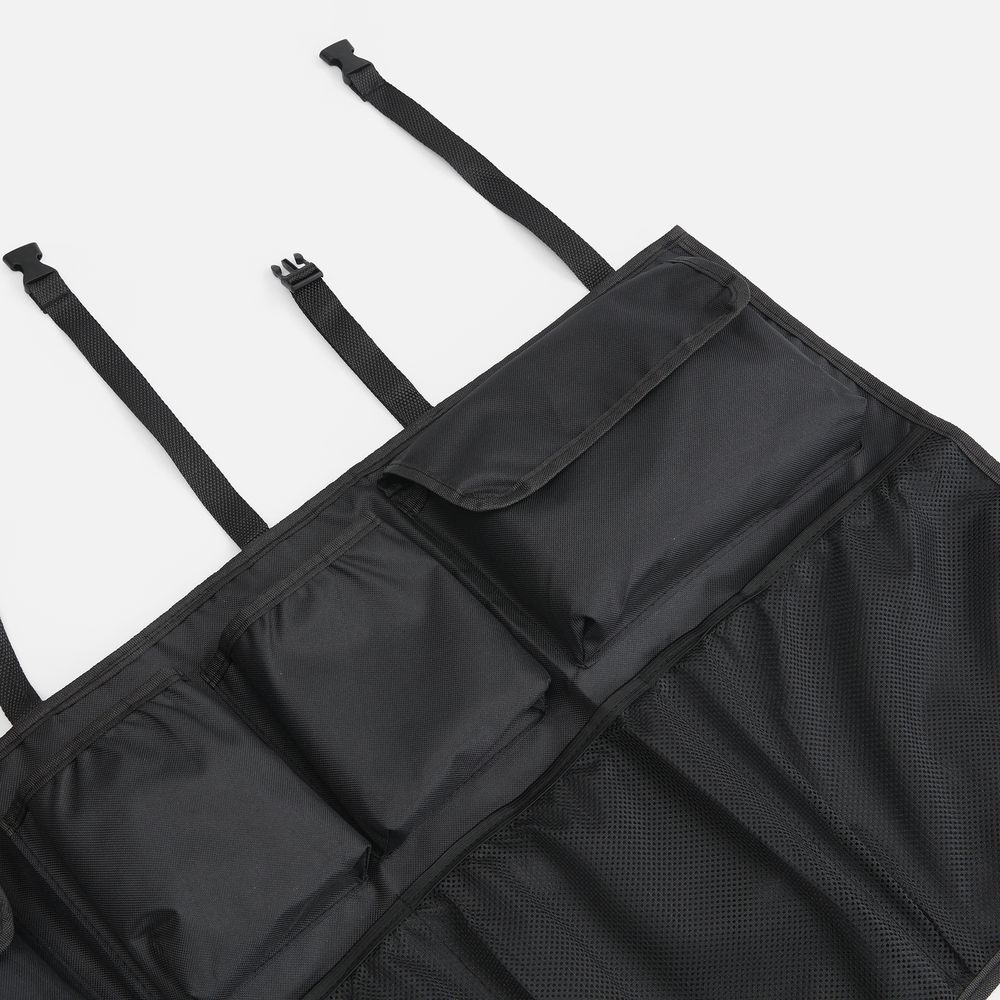 В органайзере имеются разные по форме и типу карманы: карманы-сетки, карманы с крышкой на липучке, открытые карманы.Конструкция крепится ремнями за подголовники задних сидений. Дополнительно на задней части органайзера имеются ленты-липучки, которые обеспечивают полное прилегание органайзера к спинкам задних кресел.