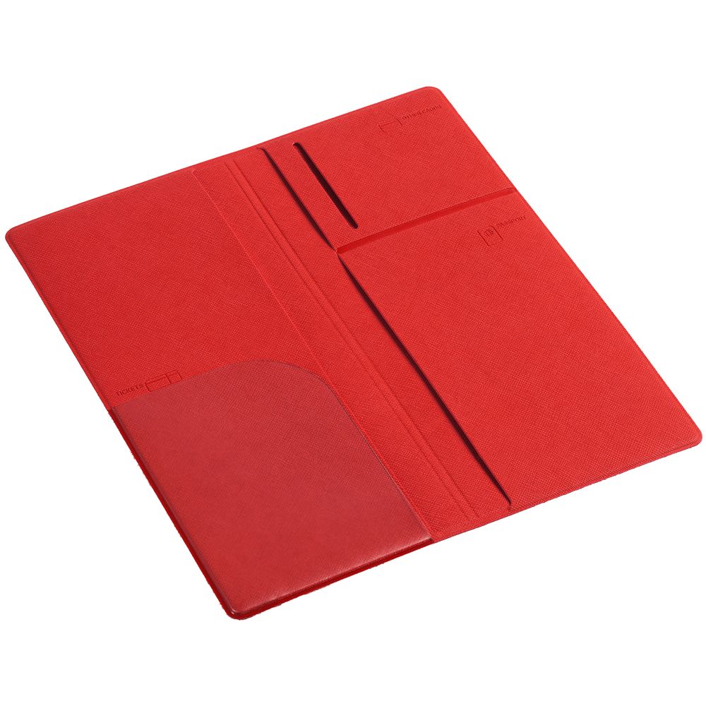 Органайзер из искусственного материала, имитирующего сафьяновую кожу, имеет 5 отделений: для билетов, паспорта, визиток или кредитных карт.