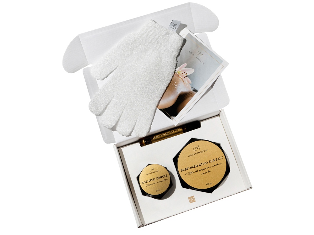 Relaxing Spa Set от Lights of Moscow подарит хорошее настроение и заряд бодрости, а также послужит полезным подарком для ваших родных, близких, друзей и коллег. SPA -набор снимет стресс, поможет восстановить внутреннюю гармонию и позволит окунуться в мир ароматов селективной парфюмерии. Каждый продукт в наборе создан по мотивам современных веяний в перфорированном искусстве. Подборка из трех топовых ароматических композиций даст возможность примерить каждый парфюм на себе, почувствовать звучание и проникнуться его настроением. Комплектность: - Подарочная брендированная коробка - 1 шт. - Ароматическая свеча, 50 мл. - 1 шт. Аромат: табак и ваниль - Парфюмированный спрей для тела, 10 мл. - 1 шт. Состав: бергамот, лимон и нейроли - Парфюмированная соль для ванны, 150 мл. - 1 шт. Состав: черный перец, амбра и нероли - Перчатка для глубокого очищения - 1 шт. - Открытка - 1 шт Условия хранения: — Свечи, аромасаше, аромадиффузоры, SPA-наборы следует хранить при температуре +18…+24 °C, вдали от источников тепла, сквозняков и прямых солнечных лучей. — Рекомендуемая влажность — не более 50%. — Избегайте длительного воздействия яркого света.