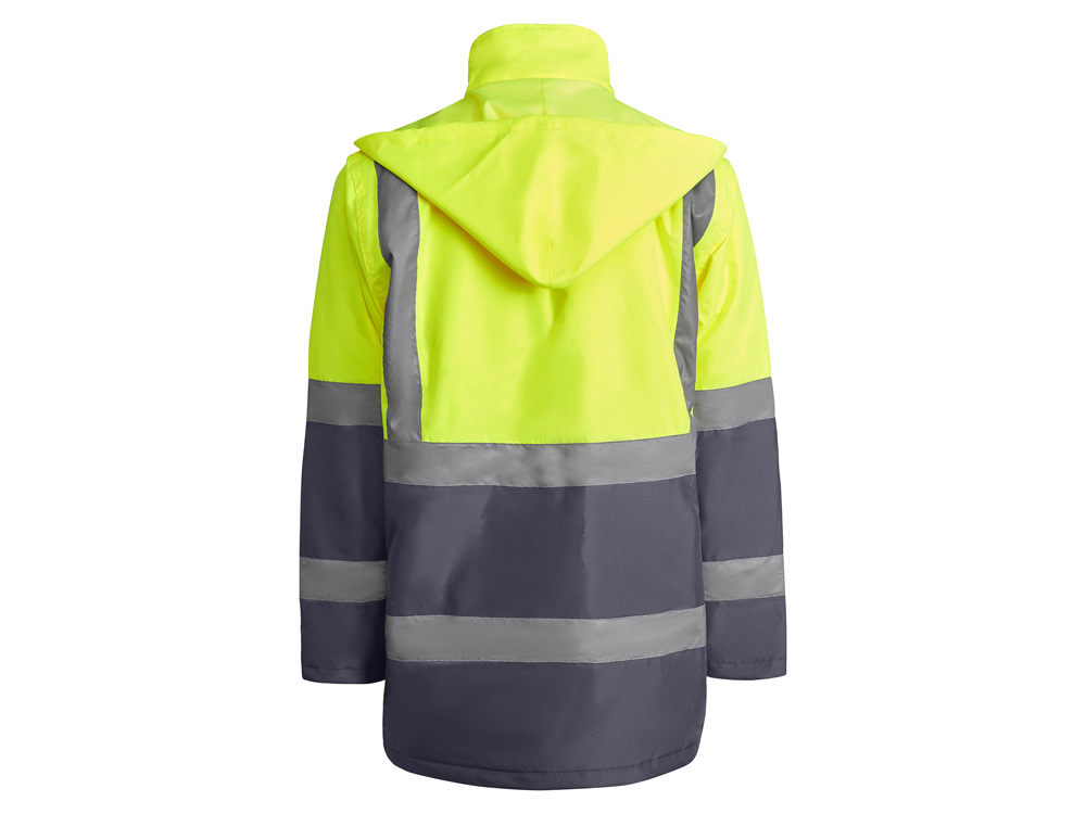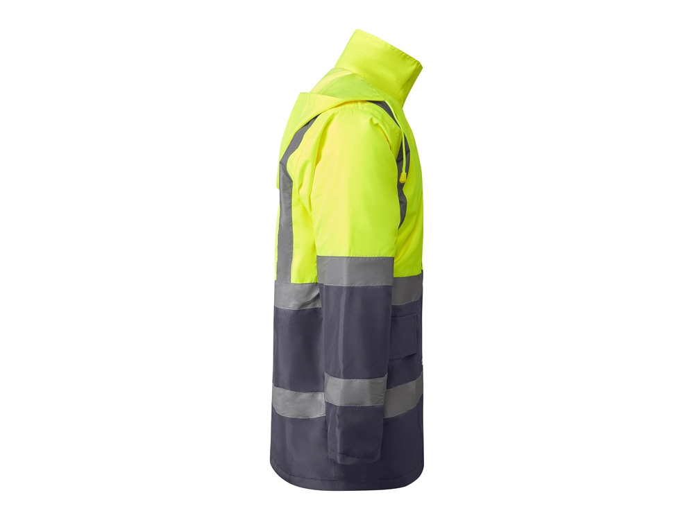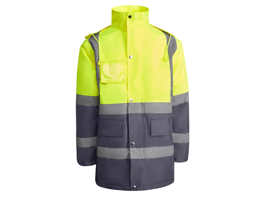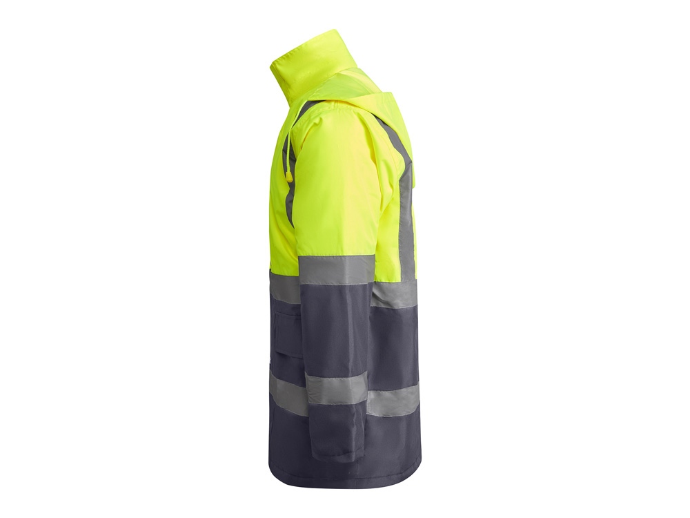 Утепленная парка со светоотражающими элементами. · Водонепроницаемая ткань с термически проклеенными швами. · Две светоотражающие горизонтальные полосы на груди и рукавах, а также вертикальные полосы на плечах. · Капюшон с регулируемой шнуровкой. · Нагрудный карман с клапаном, застежкой -липучкой и идентификационным значком. · Два передних кармана с клапанами. · Внутренний карман с застежкой·молнией. · Скрытые манжеты из риба 1x1. · Центральная металлическая застежка молния.