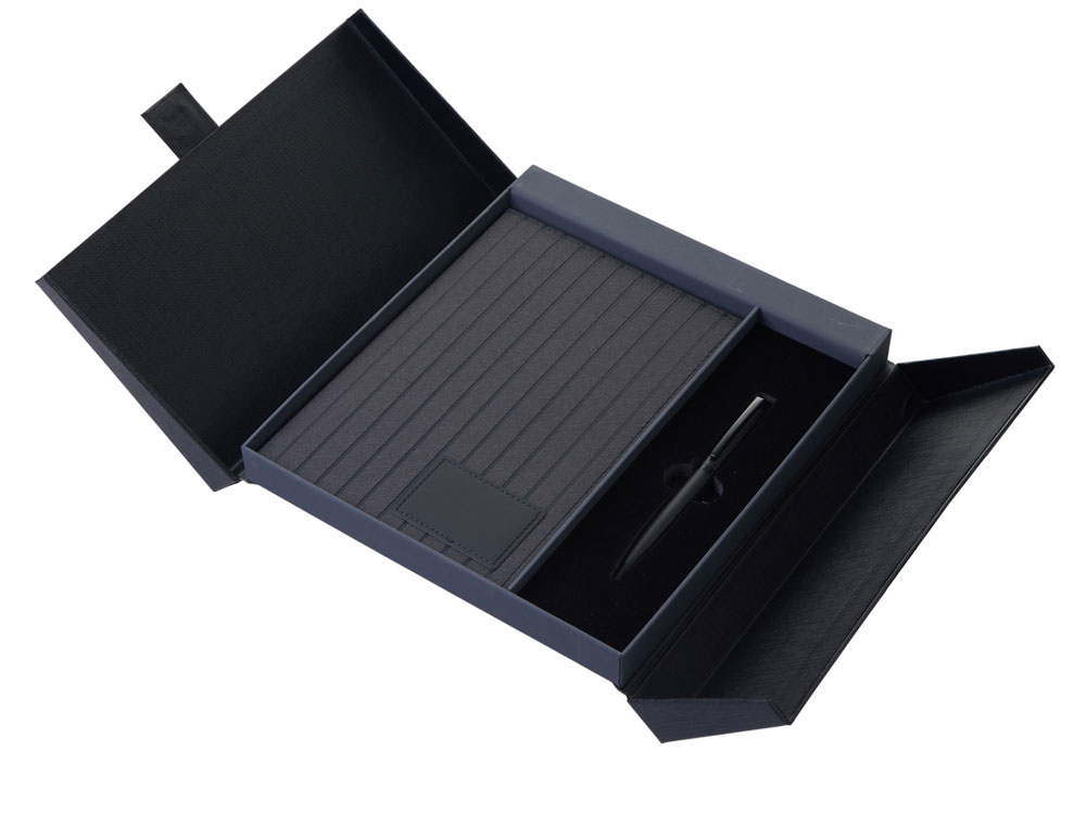 Bradbury & Co - это элегантный подарочный набор, упакованный в красивую коробку на магните. Внутри — блокнот в обложке из рифленой экокожи и металлическая шариковая ручка. Ручка гармонирует с блокнотом за счет рифленой нижней части, а блокнот имеет специальный патч для нанесения логотипа (который можно также нанести на более ровную поверхность на обороте блокнота) и ляссе-закладку для удобства. При гравировке на ручке вскрывается эффектный серебристый цвет. Внутри блокнота - 80 листов кремовой бумаги 80 г/м2 с FSC-сертификатом ответственного лесопользования. Стержень ручки заправлен синими немецкими чернилами Dokumental и швейцарским пишущим узлом Premec, что обеспечивает мягкость и плавность письма.